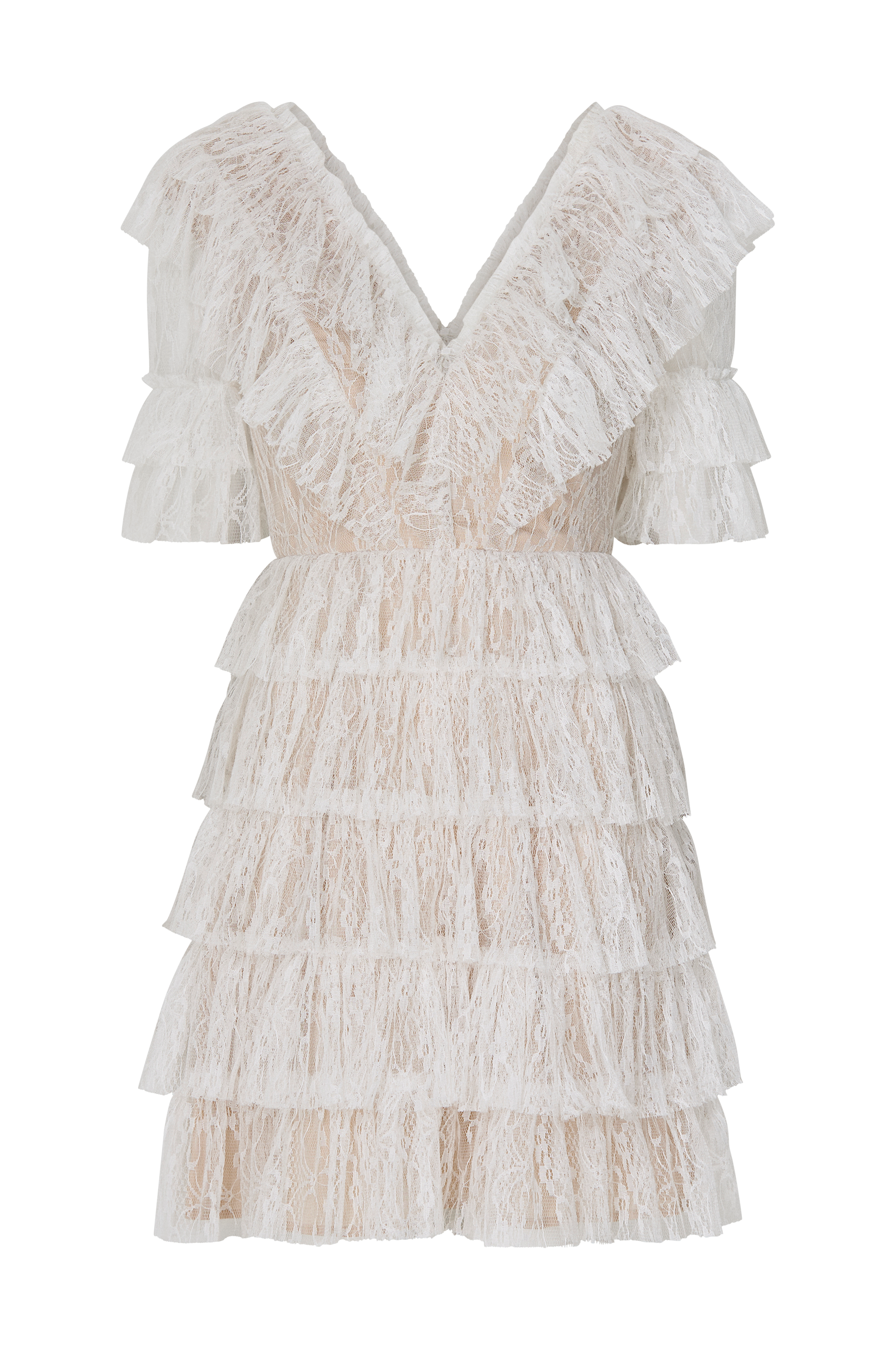 Blondekjole Sky Dress fra By Malina, en perfekt minikjole med blondeflæser og let A-formet skørt. V-udskæring både foran og bagpå samt halvlange ærmer med flæser. Skjult lynlås i den ene side. Foret. Længde ca. 90 cm i str. S.