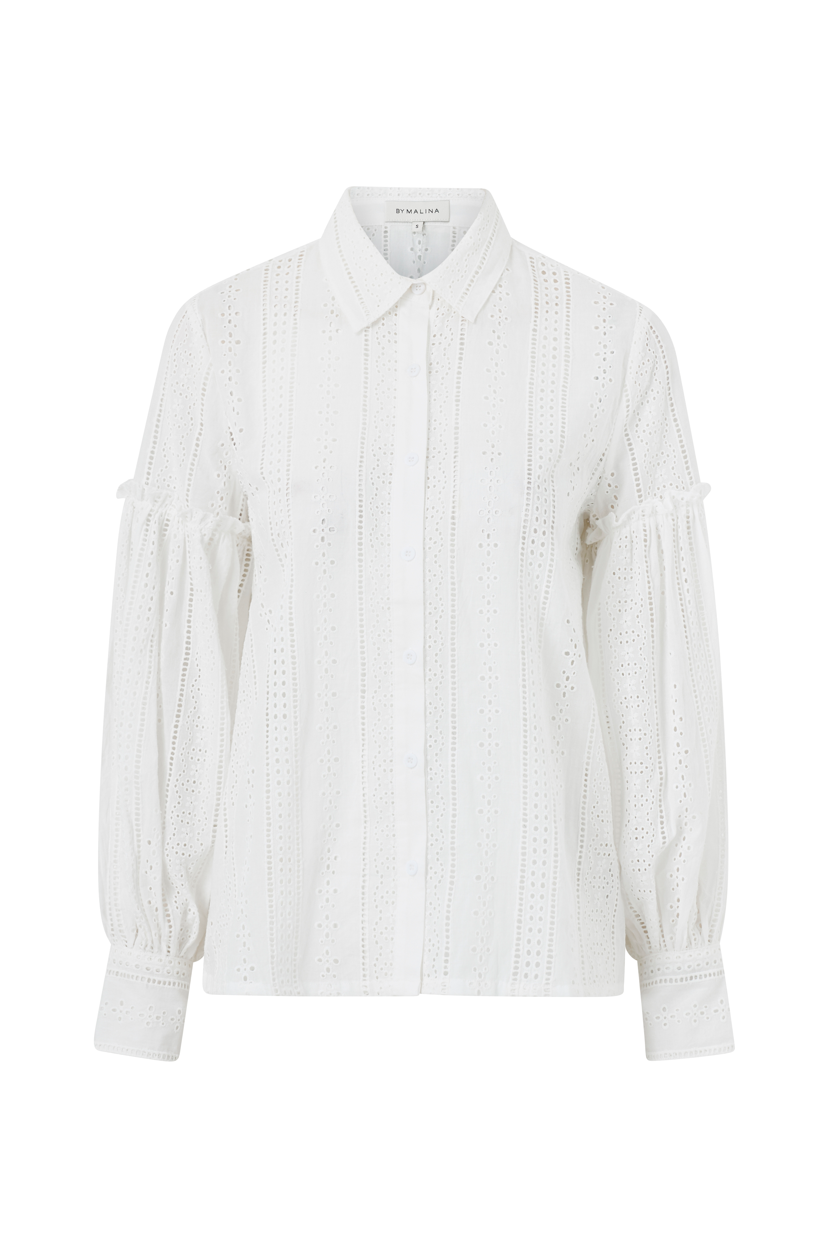 Bluse Juno Blouse fra By Malina. Lige oversizemodel i vævet bomuld med hulbroderet mønster over det hele. Lille skjortekrave og knaplukning hele vejen ned foran. Vide ærmer med afskæring og lille flæsekant foroven og manchet i ærmekanten.