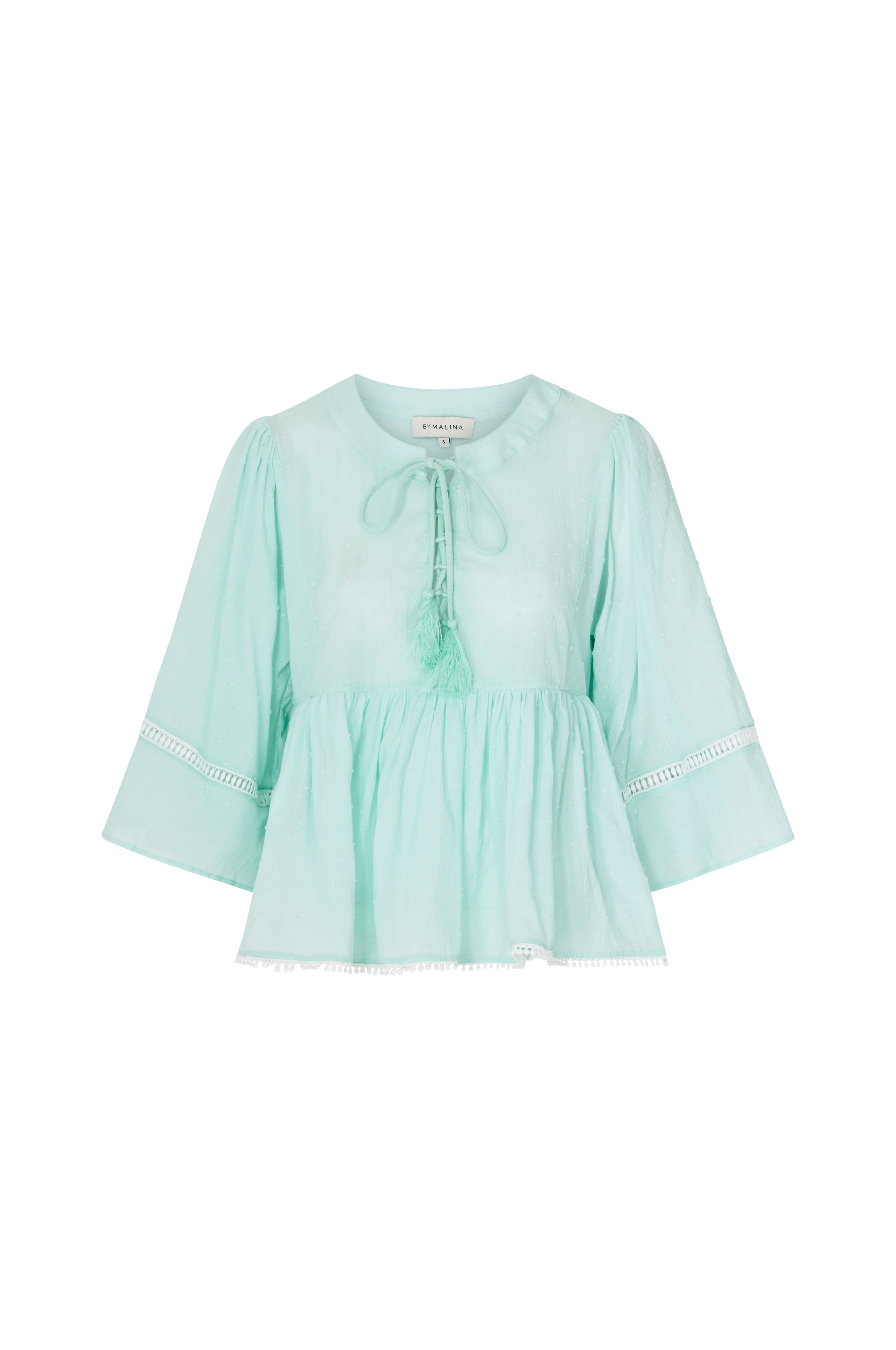 • Peplumdesign• Løs pasform• Rynket talje• Snøring foran• 3/4 lange, brede ærmer• Tynd, semitransparent kvalitet med strukturmønster