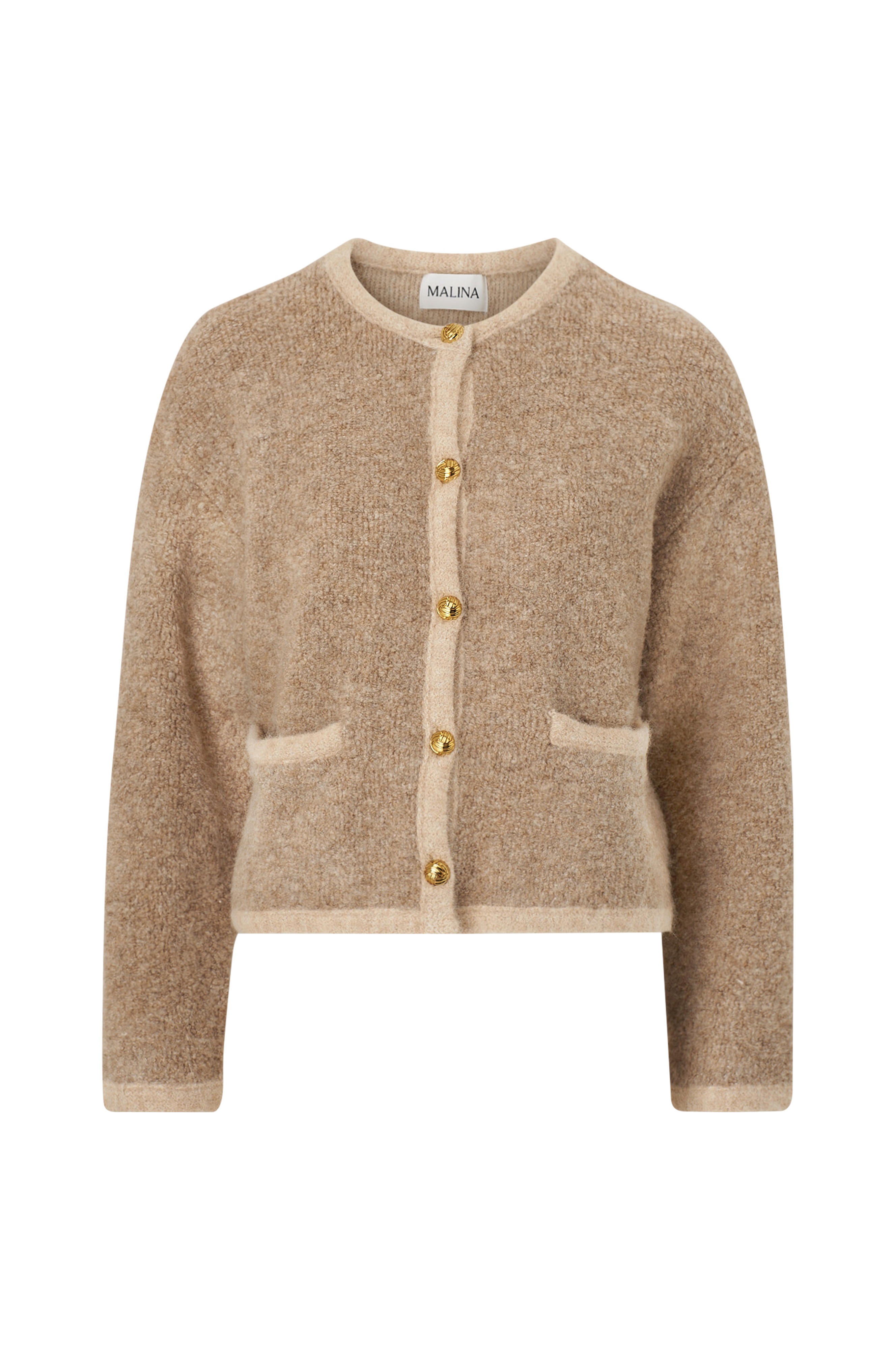 • Lige model med matchende kanter• Guldfarvede knapper foran• Nedsænket skulder med langt ærme• Indlagte lommer