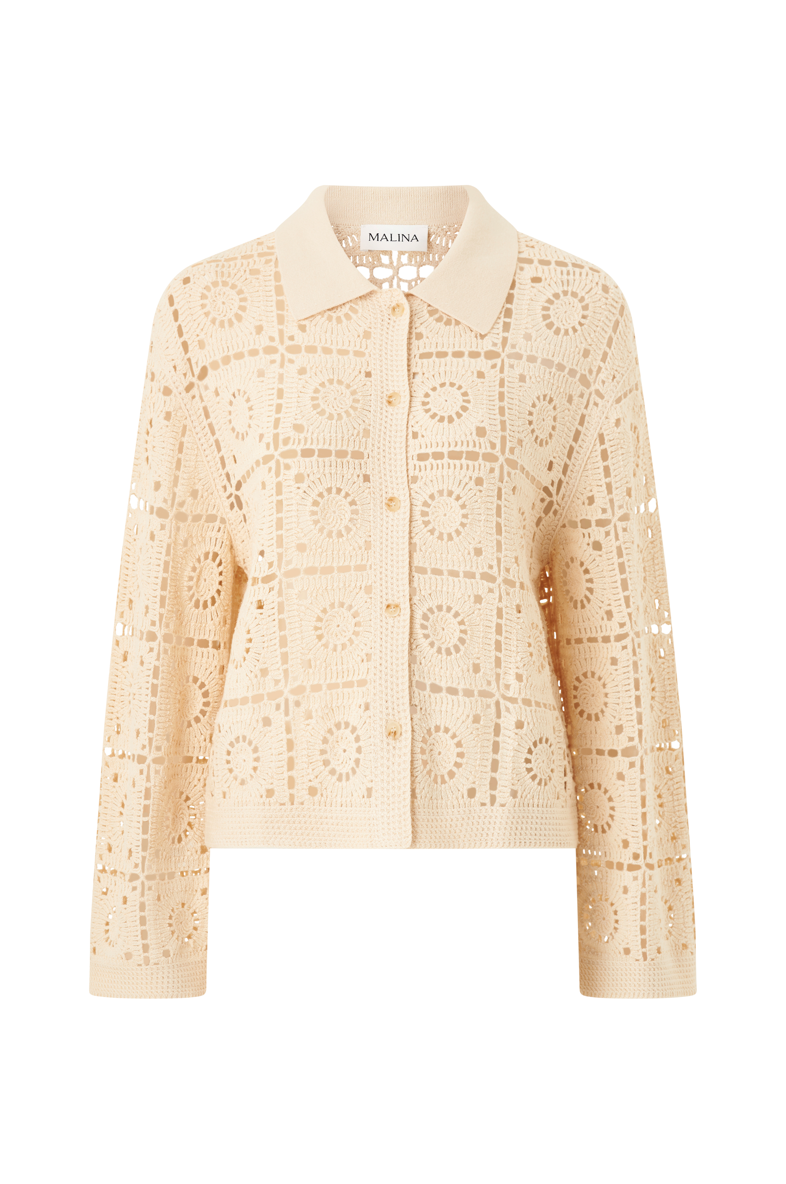 • Strikket, hulmønstret cardigan• Rund halsudskæring med krave• Lange trompetærmer• Knapper foran
