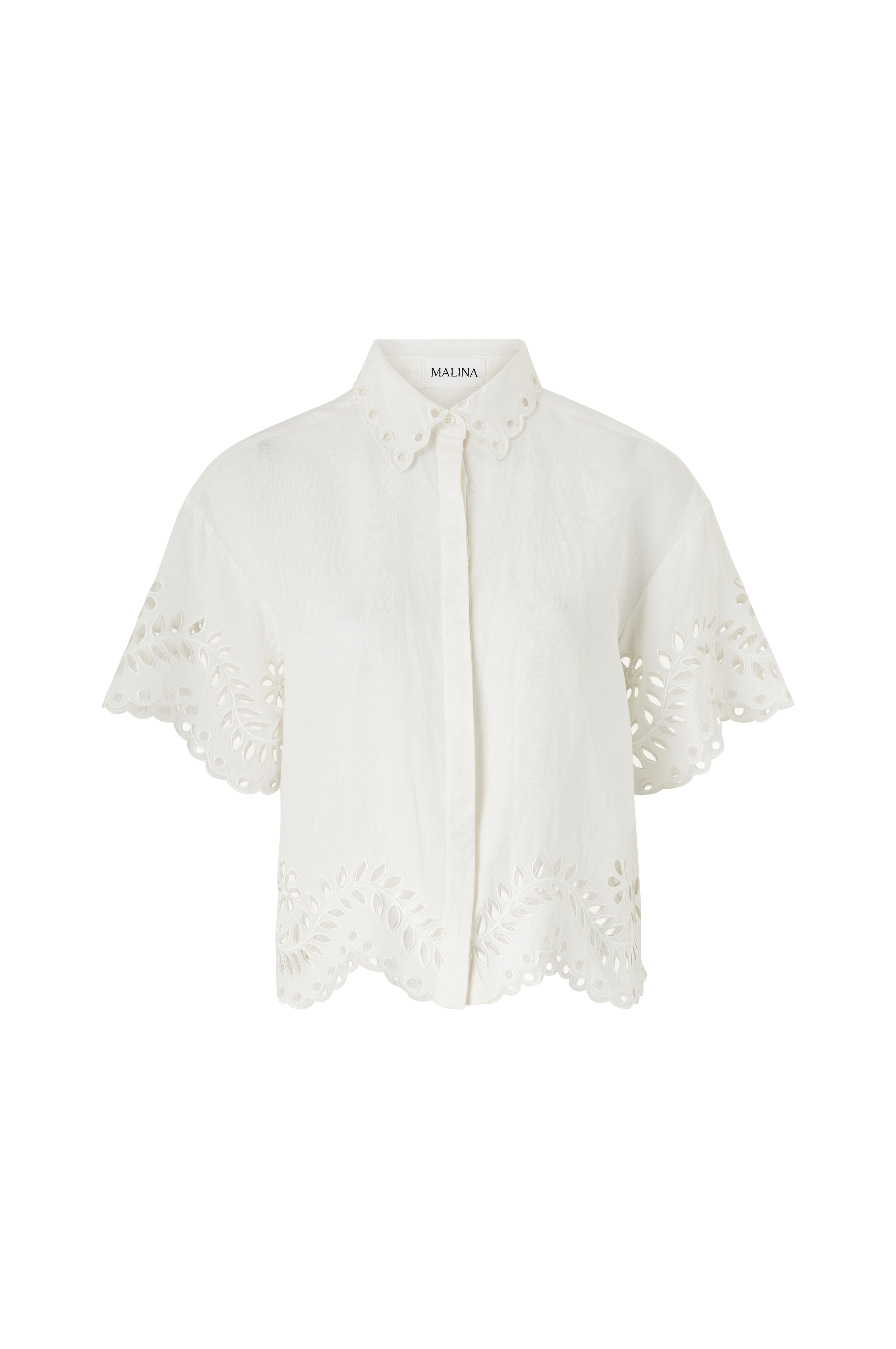 • Bred, lige model med hulbroderier• Skjulte knapper foran• Kort ærme• Bølgede kanter