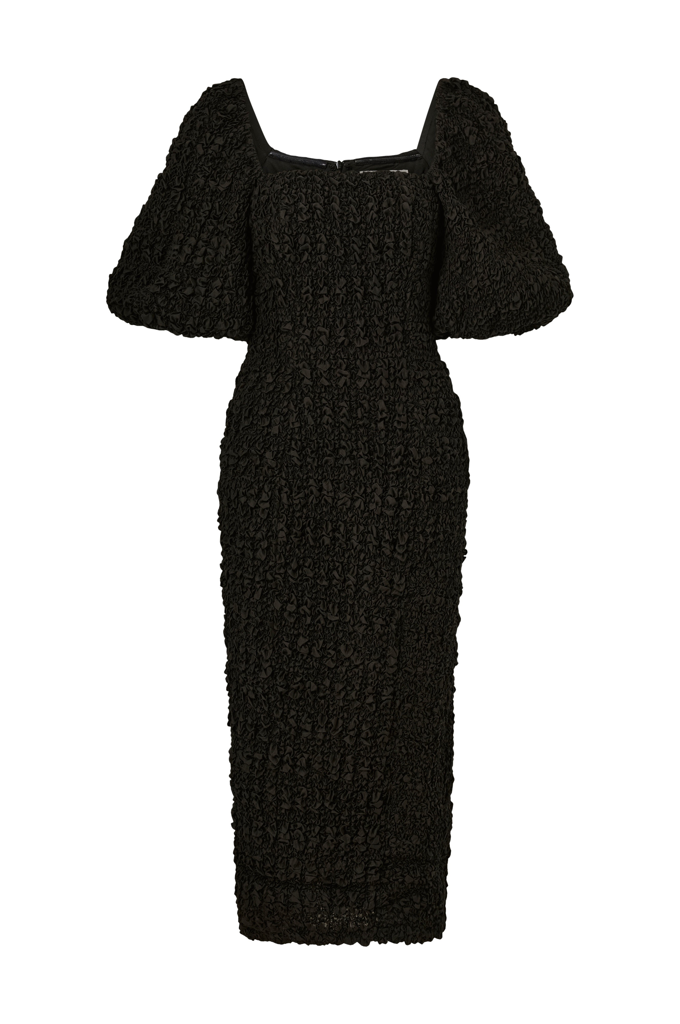 • Figursyet, smocket midikjole• Firkantet halsudskæring• Korte, voluminøse ballonærmer• Skjult lynlås i ryggen• Indre silikonekant på toppen• Længde: 125 cm i størrelse S