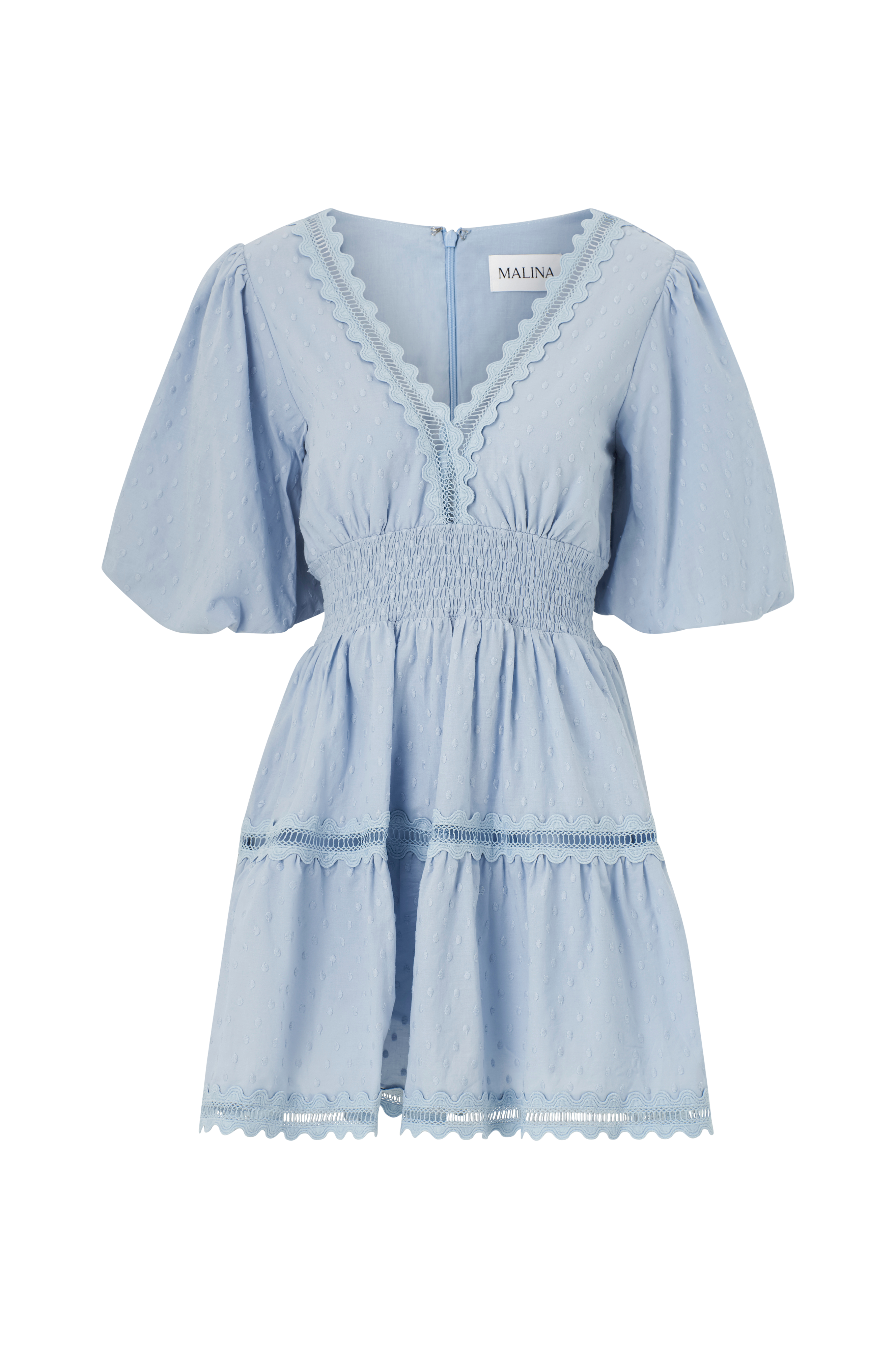 • Mini kjole med strukturmønster og broderidetaljer• Nederdel med svaj• Defineret talje med smock• Korte ballonærmer• Skjult lynlås i ryggen• Vævet for• Længde: 83 cm i størrelse S
