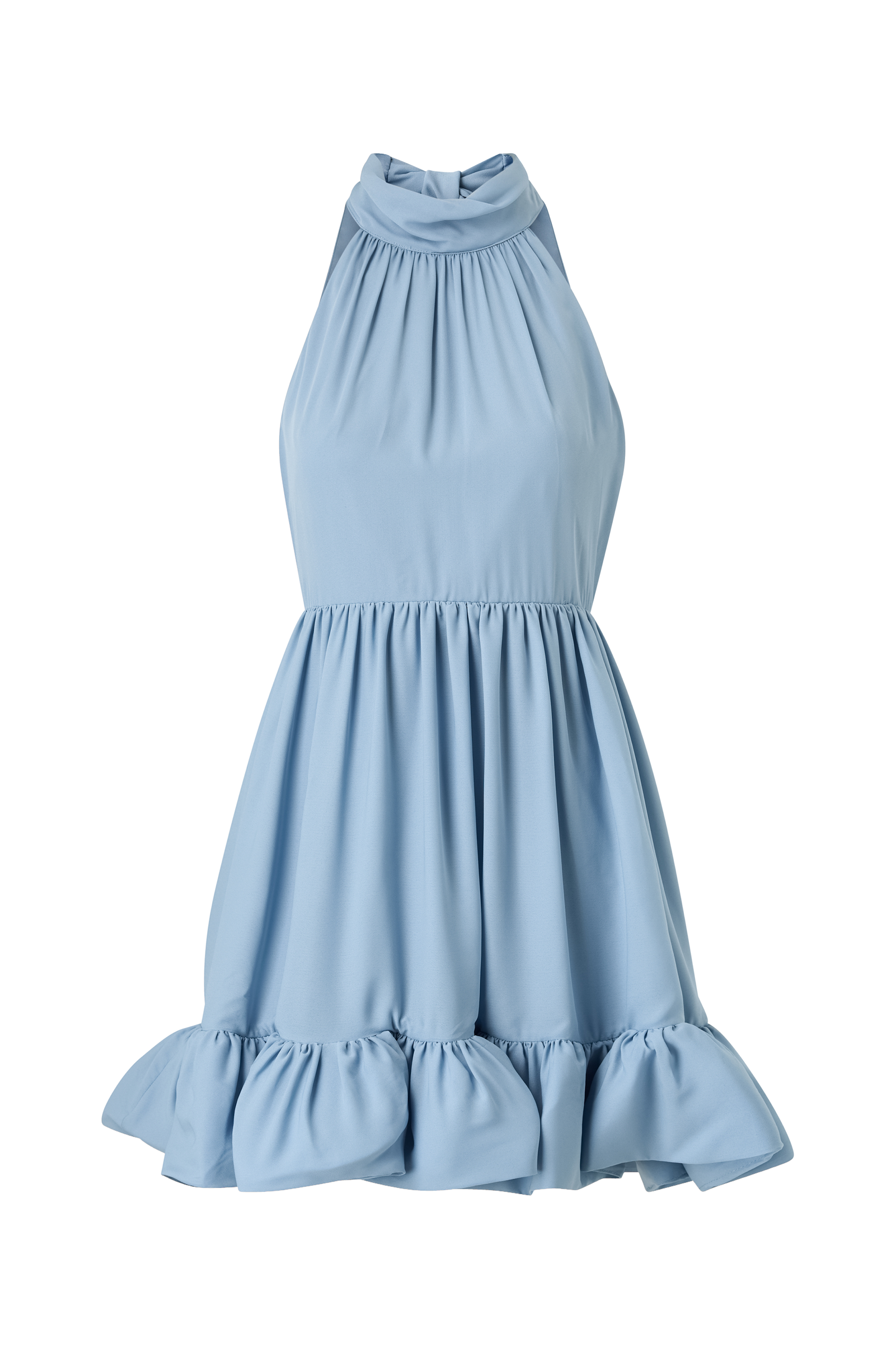• Mini kjole med åben ryg• Halterneckdesign med bindebånd i nakken• Nederdel med volantdetalje• Lynlås bagpå• Længde: 88 cm i størrelse S