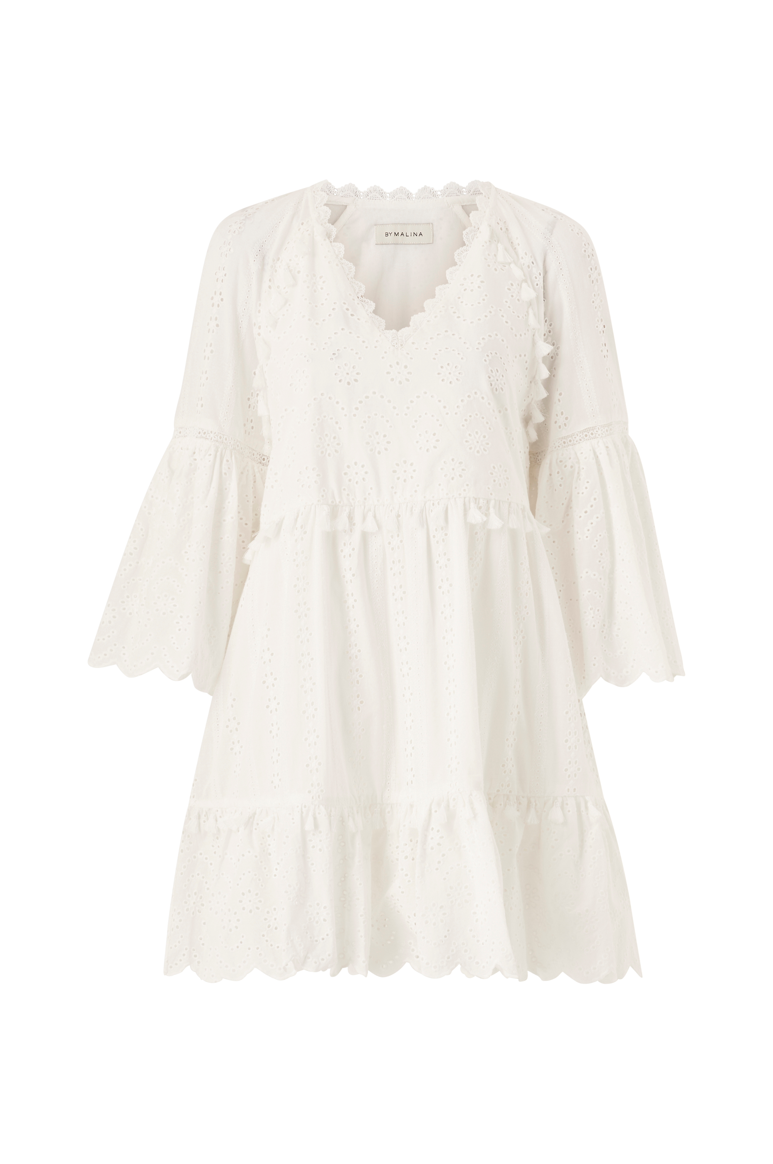 • Kort kjole med svaj• Trompetærmer med svaj• V-udskæring med blondekant• Dekorative kvaster ved taljen og på skørtet• Broderet hulmønster• Foret• Længde: 85 cm i størrelse S