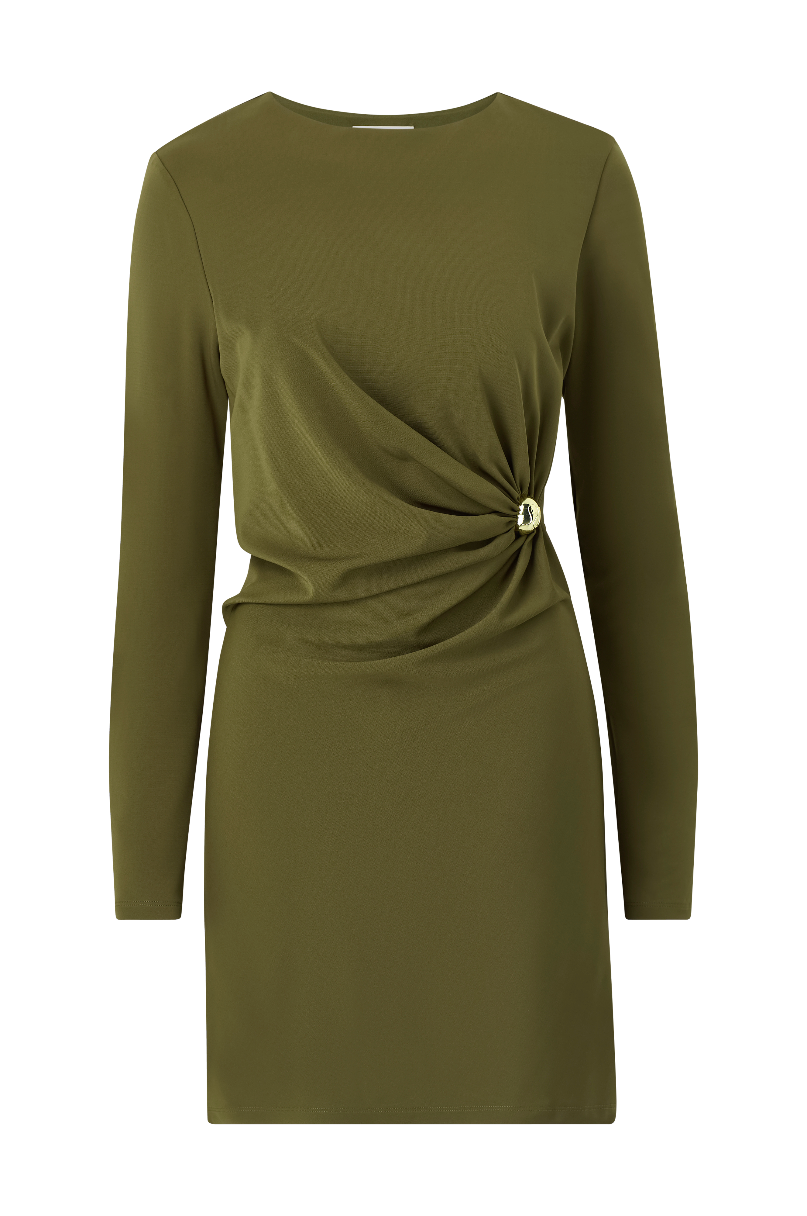• Kort, foret kjole i viskoseblanding• Rund halsudskæring• Lange ærmer• Drapering i den ene side med dekorativ brosche• Normal pasform• Længde: 89 cm i størrelse S