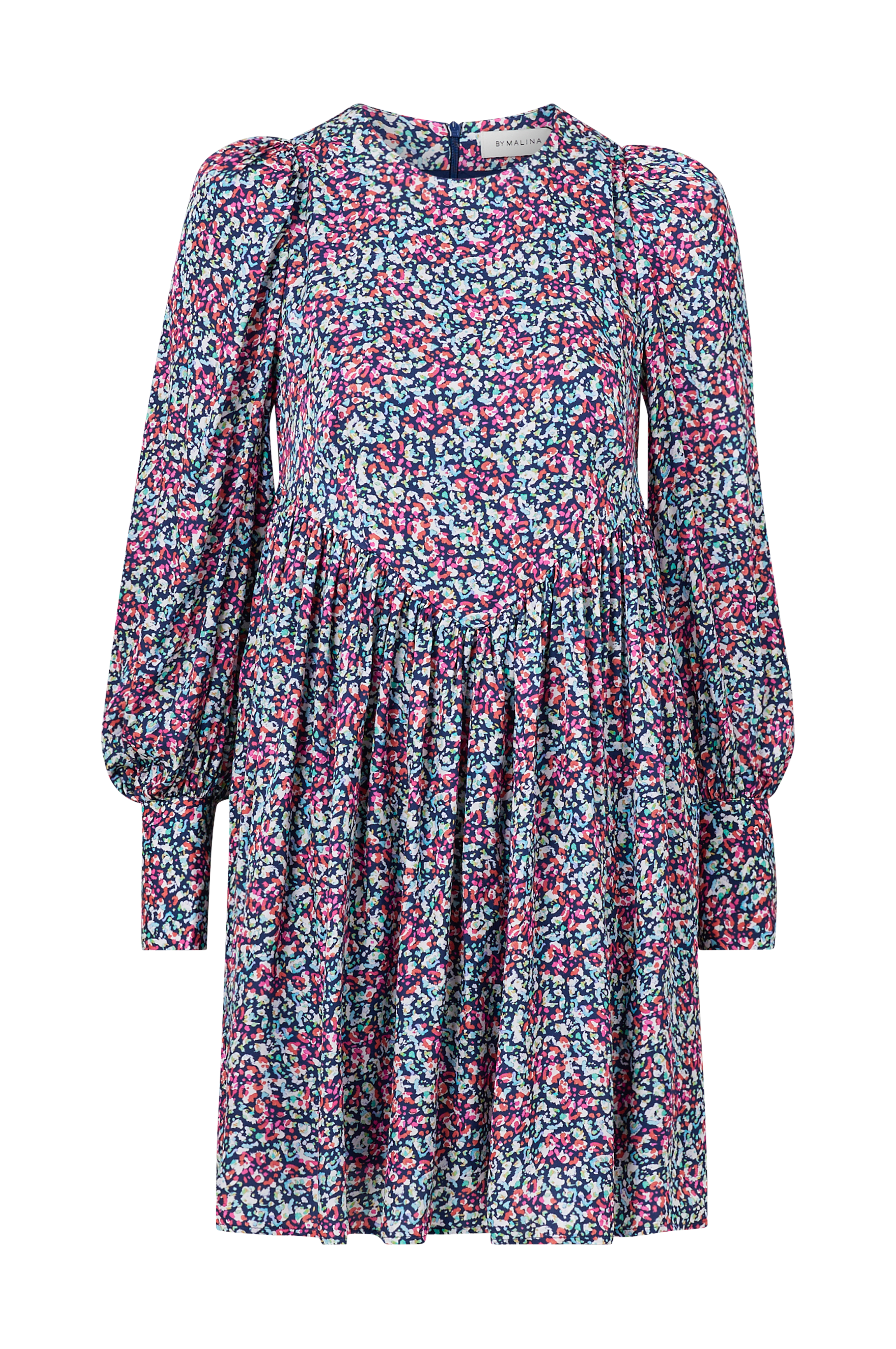 Kjole Millie Dress fra By Malina. Model i vævet satin med v-formet afskæring og rynkning både foran og bagpå i taljen. Rund hals med skjult lynlås i ryggen og langt pufærme med rynkning ved skulderen og indvendig skulderpude samt bred manchet i ærmekanten. Længde ca. 89 cm i str. S.