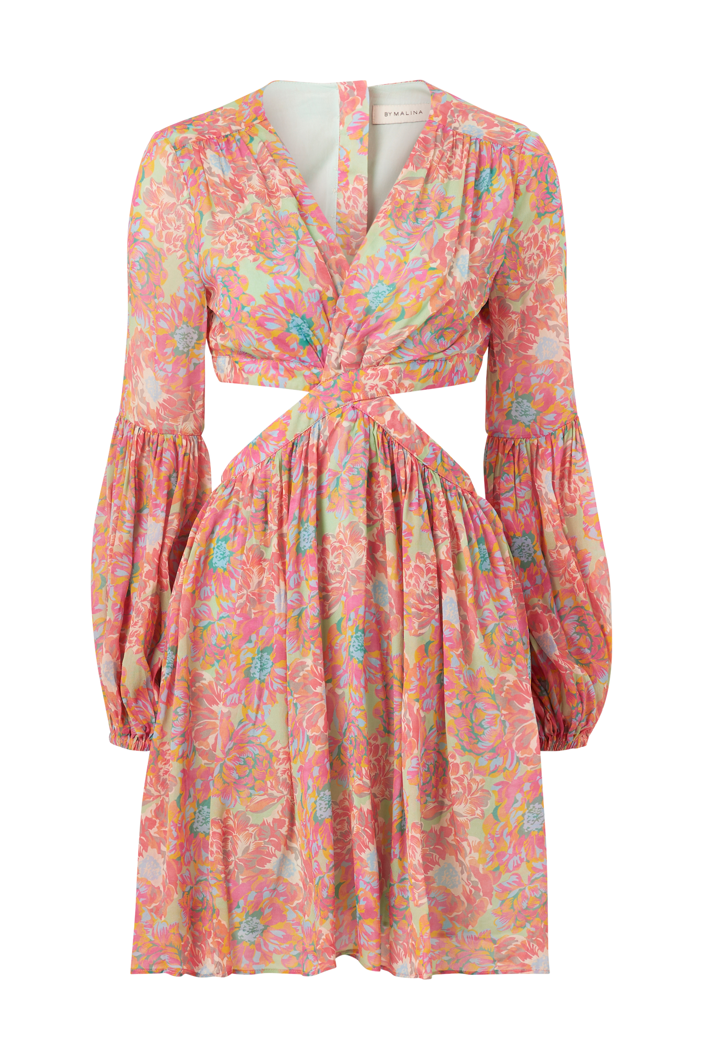 • Åbne sider• Dyb v-udskæring• Samling på skuldrene• Knapper bagpå• Skjult lynlås i siden• Fremstillet af chiffon• Foret• Længde: 90 cm i størrelse S