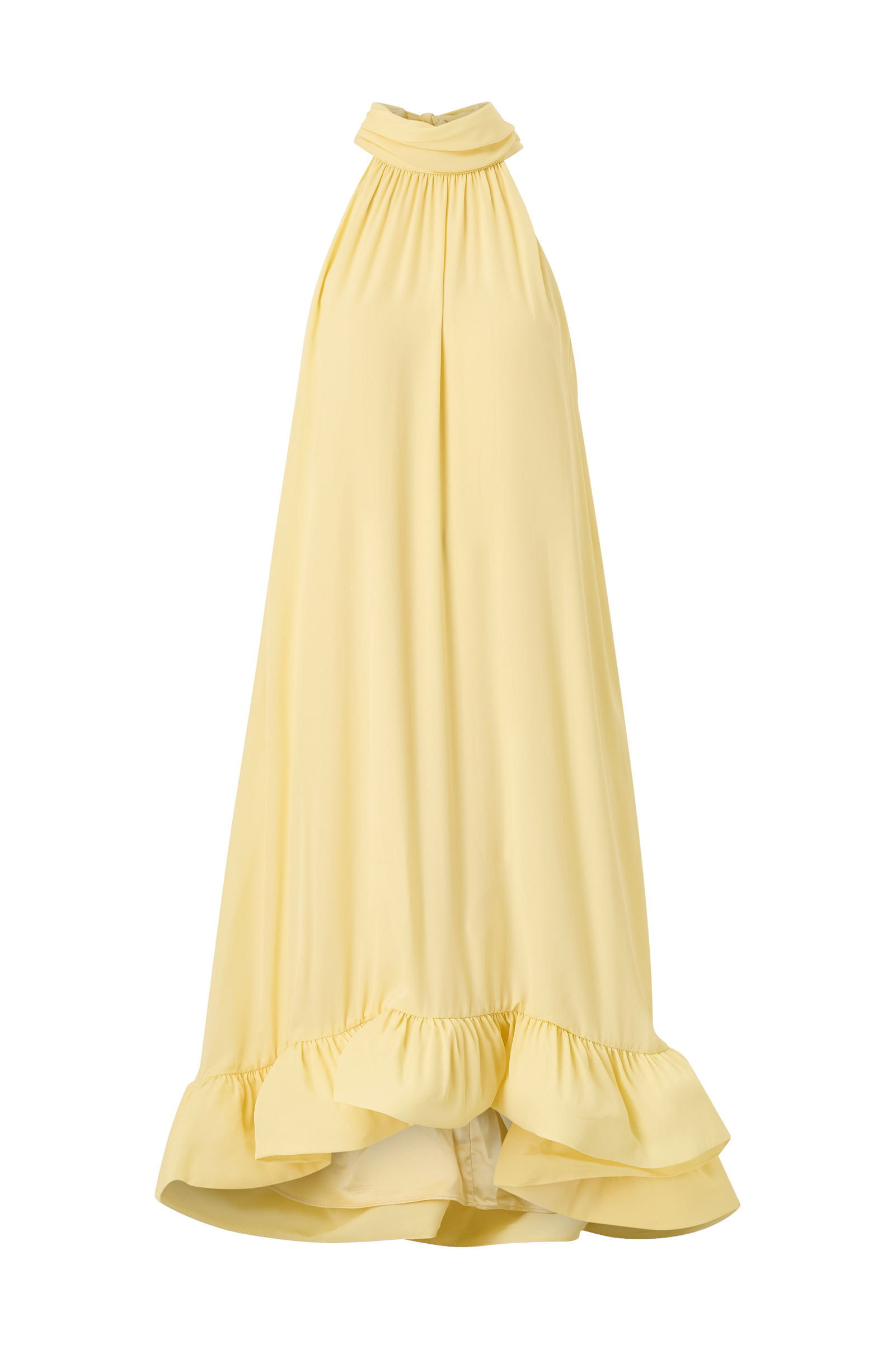 • Ærmeløs, foret kjole i chiffon• Model med svaj med flæsekant nederst• Halterneck med samling foran og bindebånd i nakken• Lynlås bagpå• Længere bagside• Længde: 129 cm i størrelse S