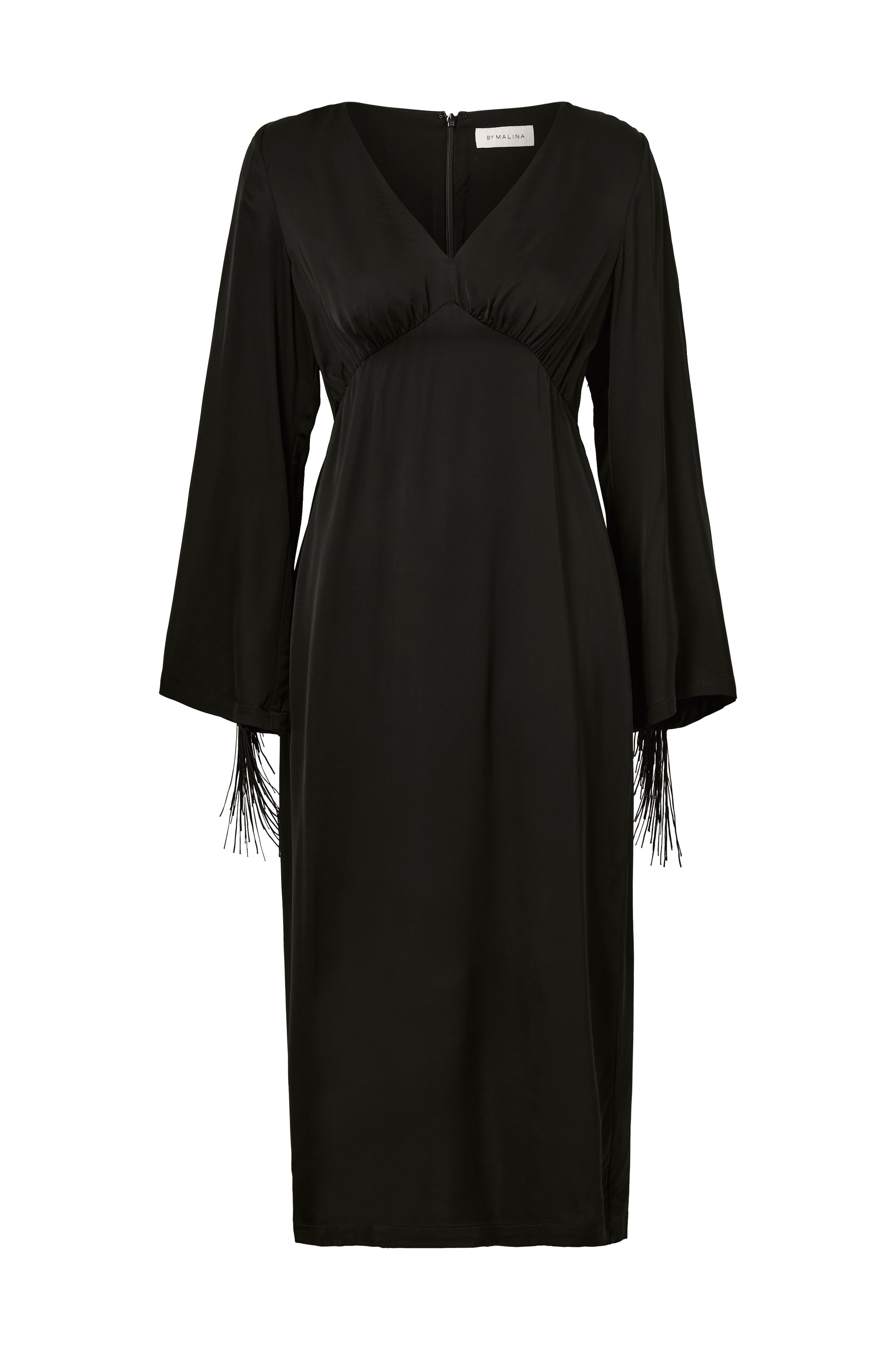 • Kjole i satin• V-udskæring• Samling ved brystet• Lange, brede ærmer med frynser• Frynser bagpå• Skjult lynlås i ryggen• Længde: 118 cm i størrelse S
