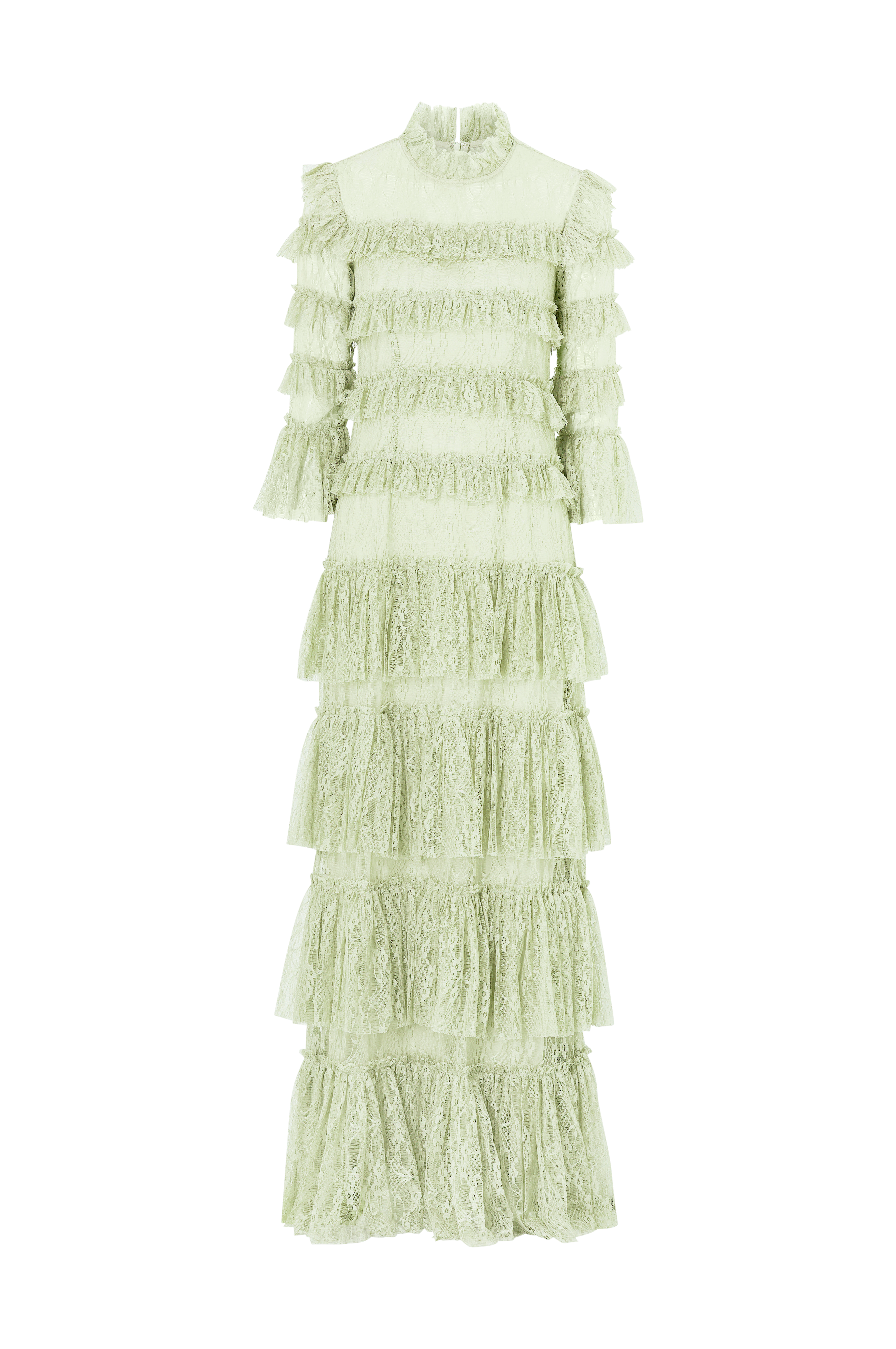 • Fornem festkjole i blonde med volanter overalt• Høj udskæring med volant• Skjult lynlås bagpå• 3/4 lange ærmer med volanter• Foret• Længde: 161 cm i størrelse M