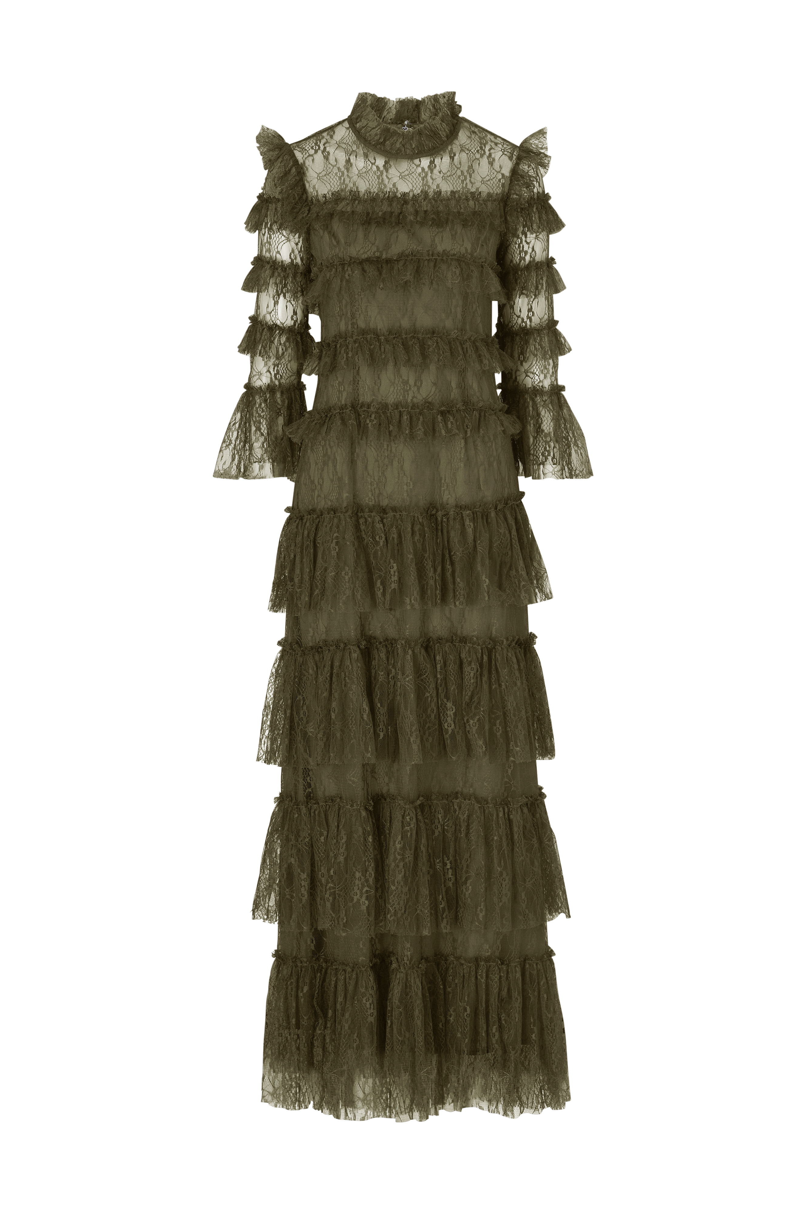 • Fornem festkjole i blonde med volanter overalt• Høj udskæring med volant• Skjult lynlås bagpå• 3/4 lange ærmer med volanter• Foret• Længde: 161 cm i størrelse M