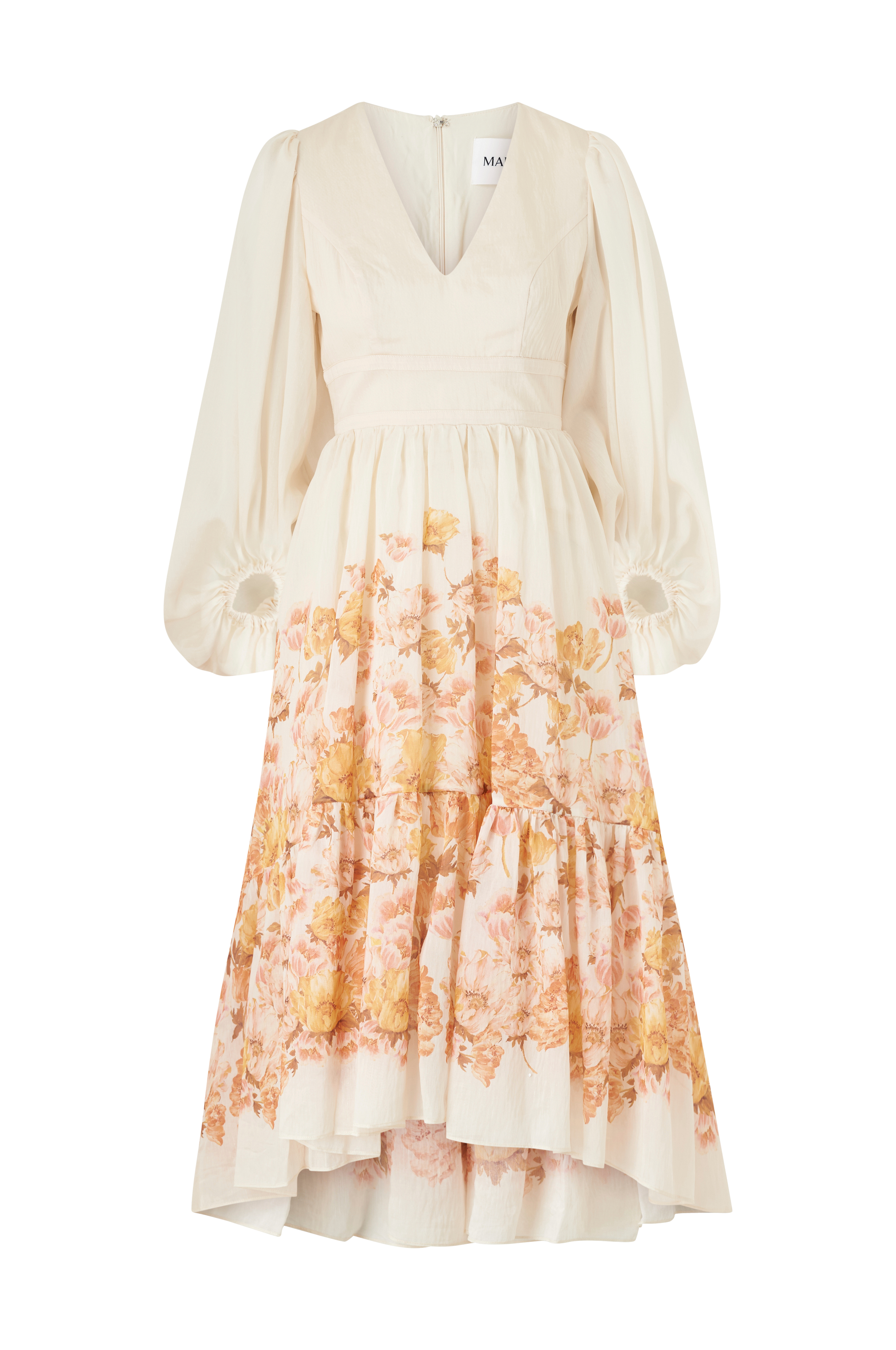 • Lang, figurformede model med bred nederdel• Dyb v-udskæring• Lynlås i ryggen• Langt, ekstra bredt ballonærme med elastik nederst• Markeret talje• Bred volant ved nederste kant med længere bagside• Foret• Længde: 131 cm i størrelse 38