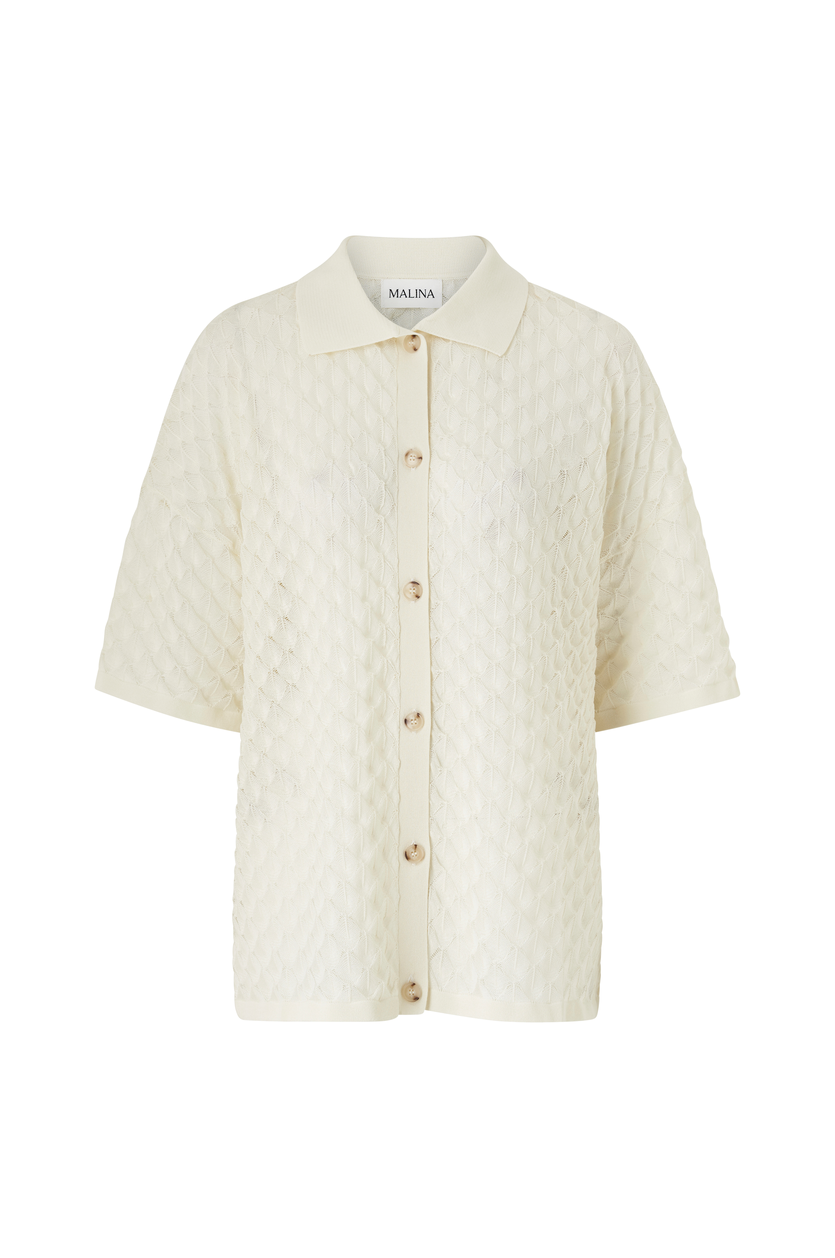 • Bred, mønsterstrikket model• Krave• Knapper foran• Nedsænket skulder med kort ærme• Glatstrikkede kanter