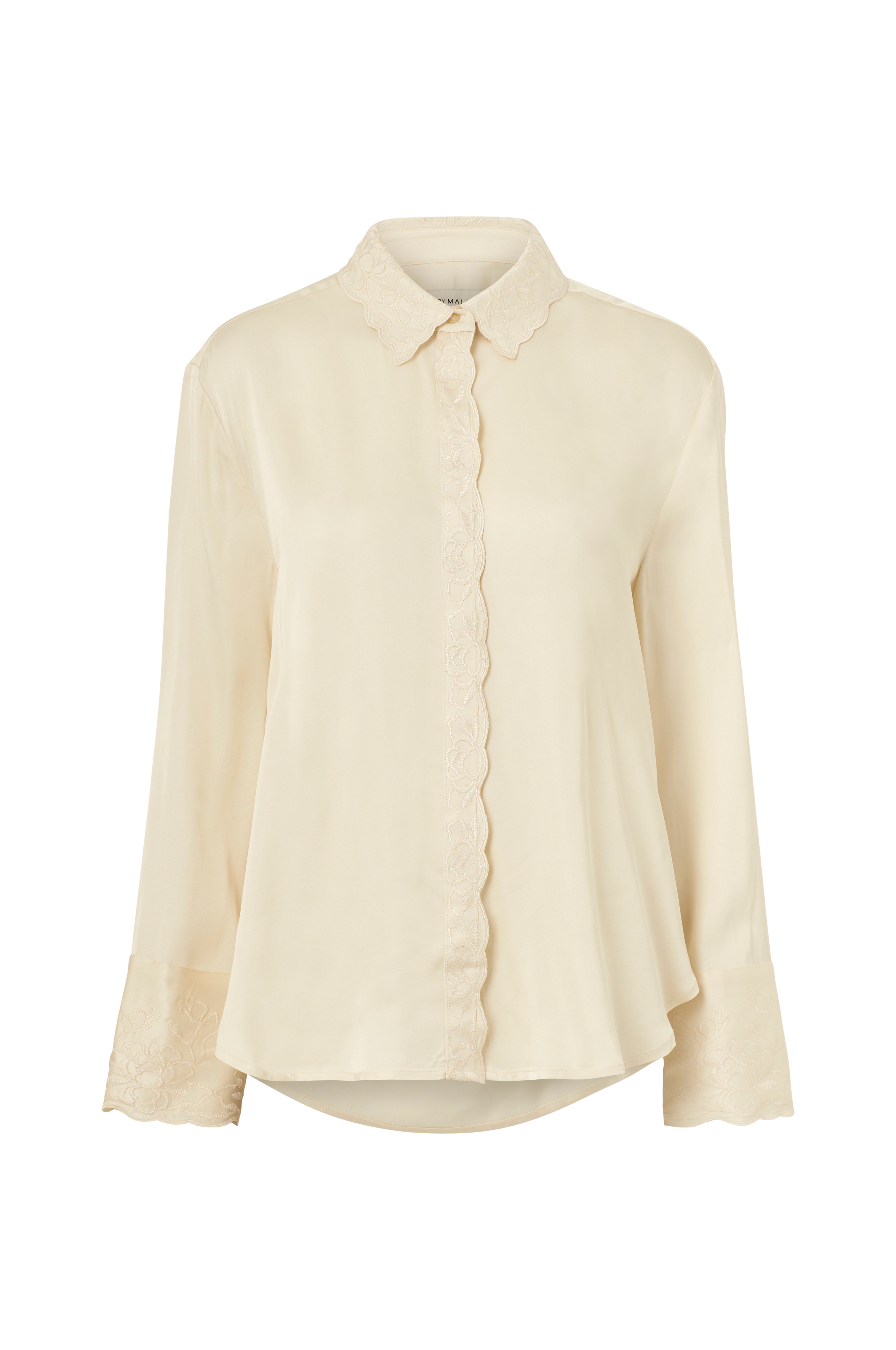• Skjorte i satin• Skjulte knapper foran• Broderi på kraven, på knaplukningen og oppe foran• Afrundet søm