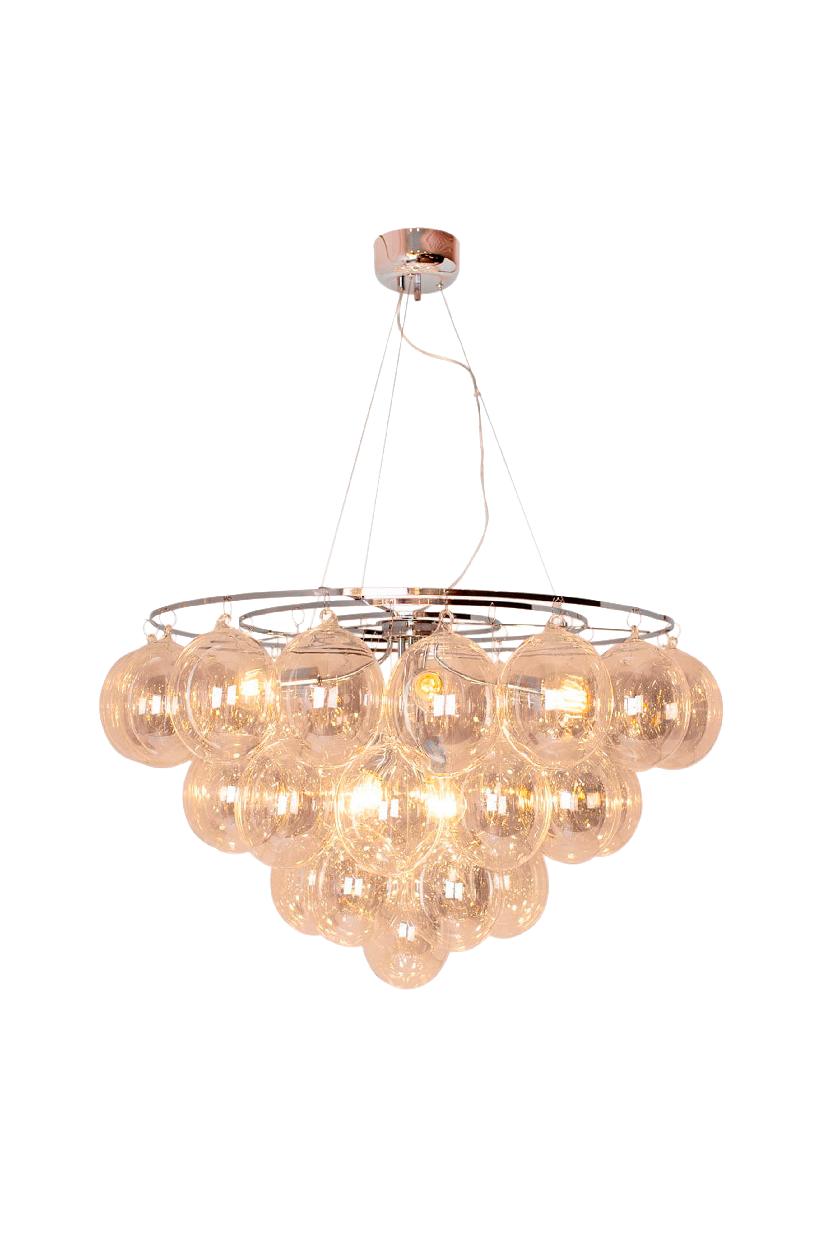 Den seneste tilføjelse til vores populære gross-serie. gross giant er en fantastisk, eksklusiv loftslampe, der består af 36 delikate glasperler. Glasperlerne er 15 cm i diameter og 18 cm lange, og de er fastgjort til metalcirkler i forskellige niveauer, som tilsammen danner en moderne lysekrone. Loftslampen er 1 m i diameter og 60 cm høj. Denne store, storslåede loftslampe passer perfekt i store rum.