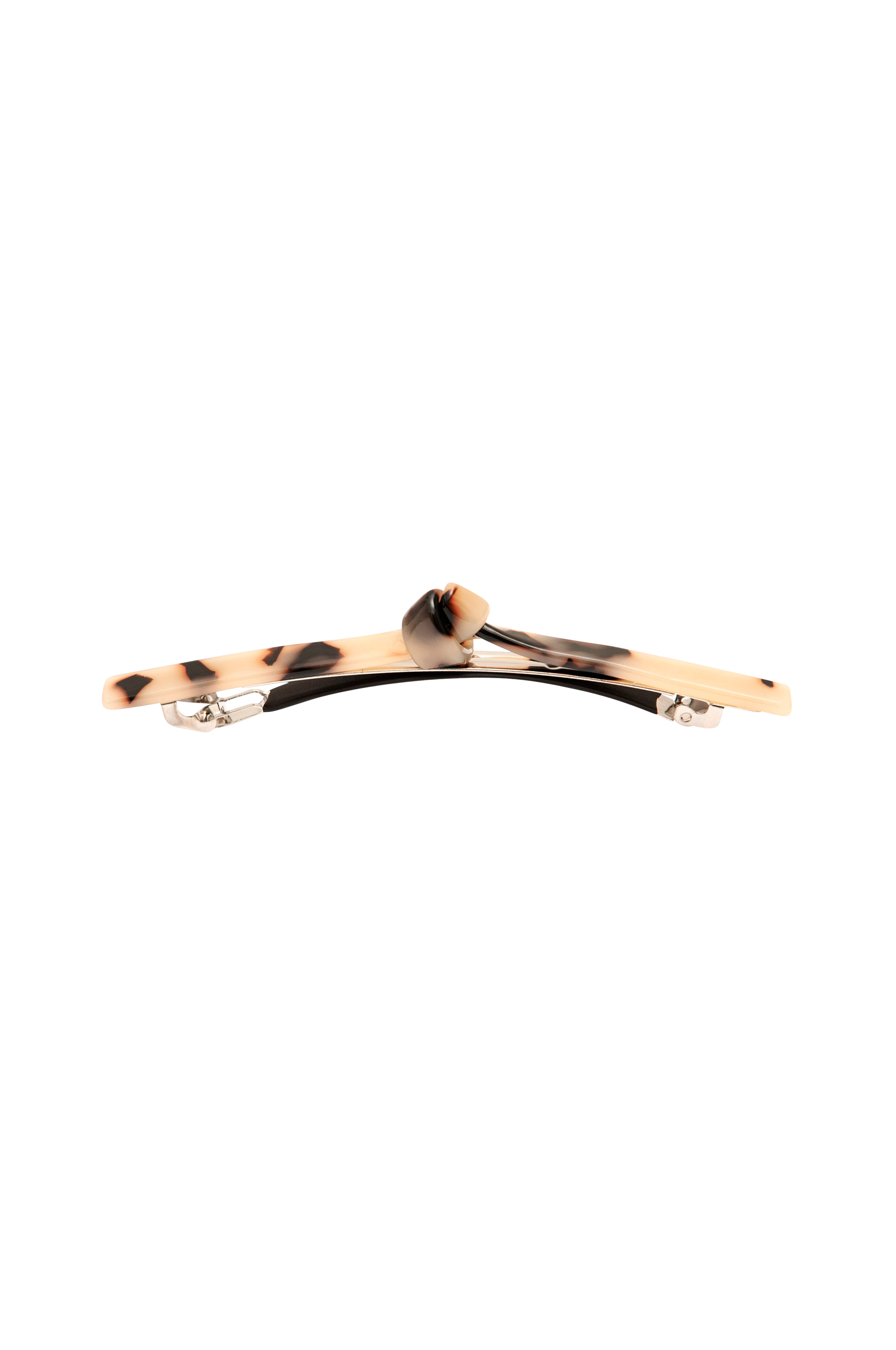 Lige, skildpaddefarvet hårspænde i acetat med knudedetalje og stabil push clip-lukning.Størrelse: 11 x 0,8 cm. Materiale: acetat og metal.