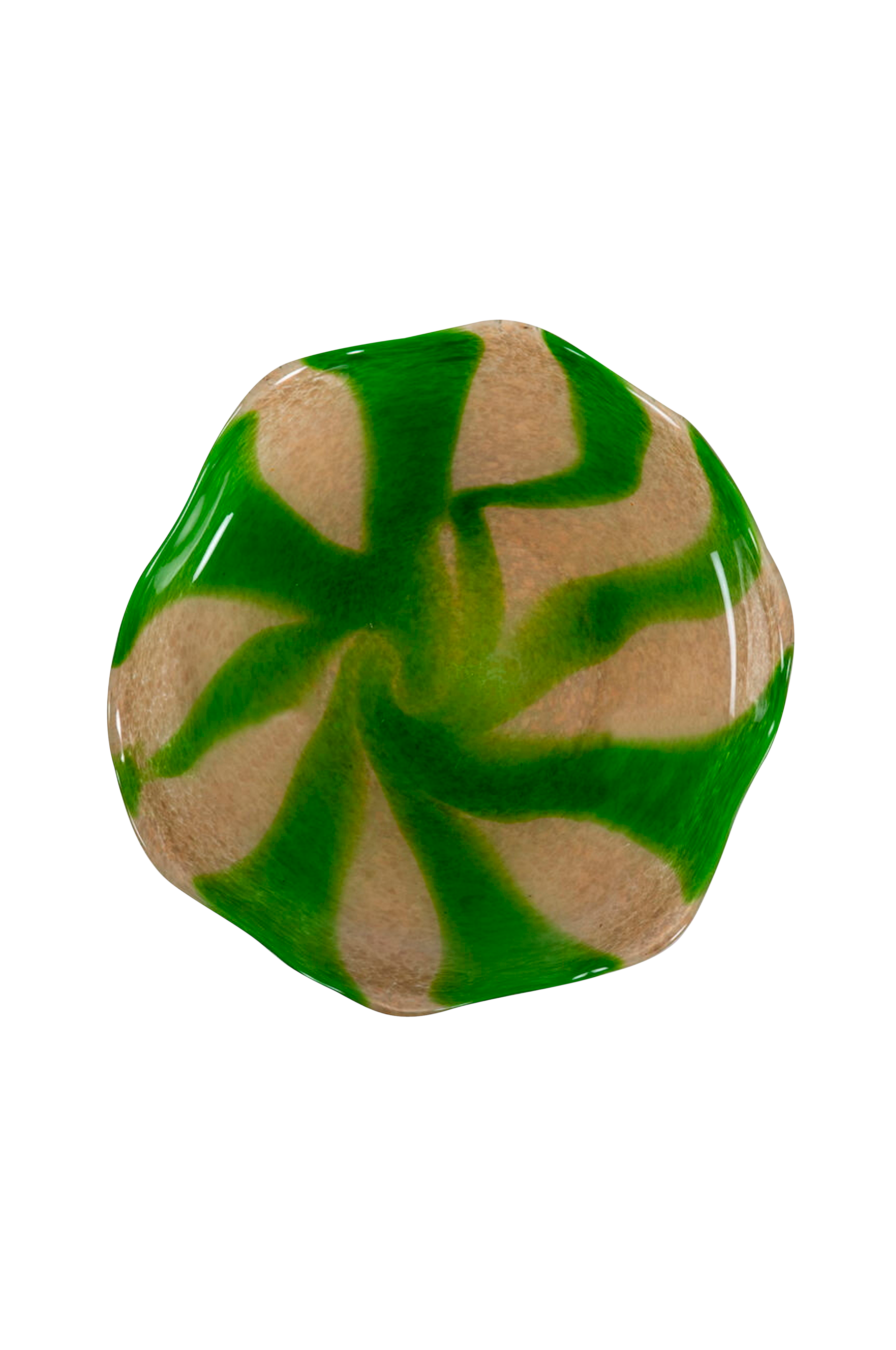 Håndlavet fad i organisk form med fantastiske kurver af glas. Luksuriøst, meget og bare extravagant. Dette fad taler for sig selv og tager sin plads på ethvert bord og enhver hylde i dit hjem. Diameter 27 cm og højde 4 cm.