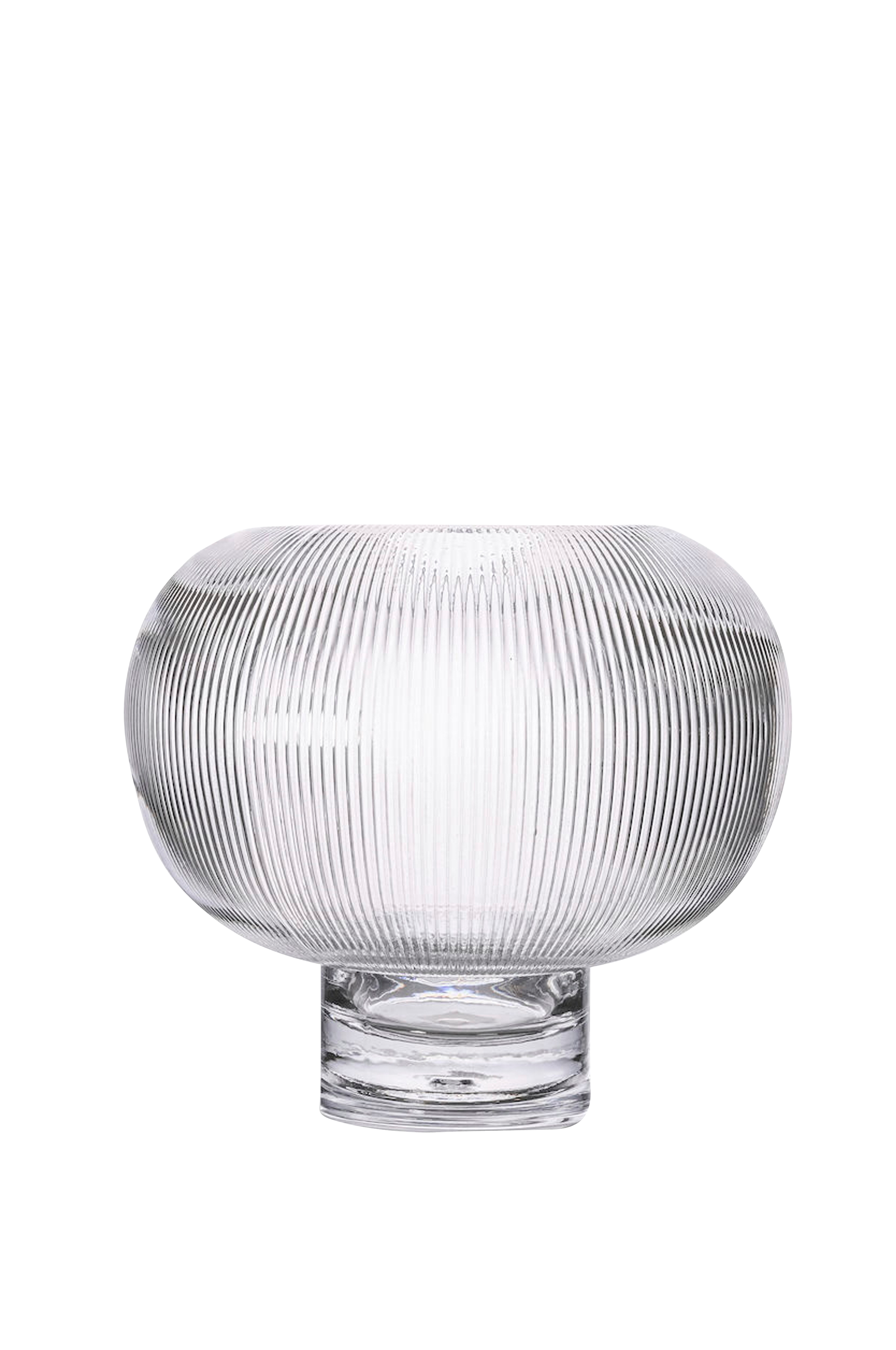 Den perfekte glasvase til de fleste buketter, enkel at arrangere i med sin fod i bunden, hvor man får fin støtte til stilkene. I riflet glas som giver fin struktur. L:28xW:28xH:24 cm