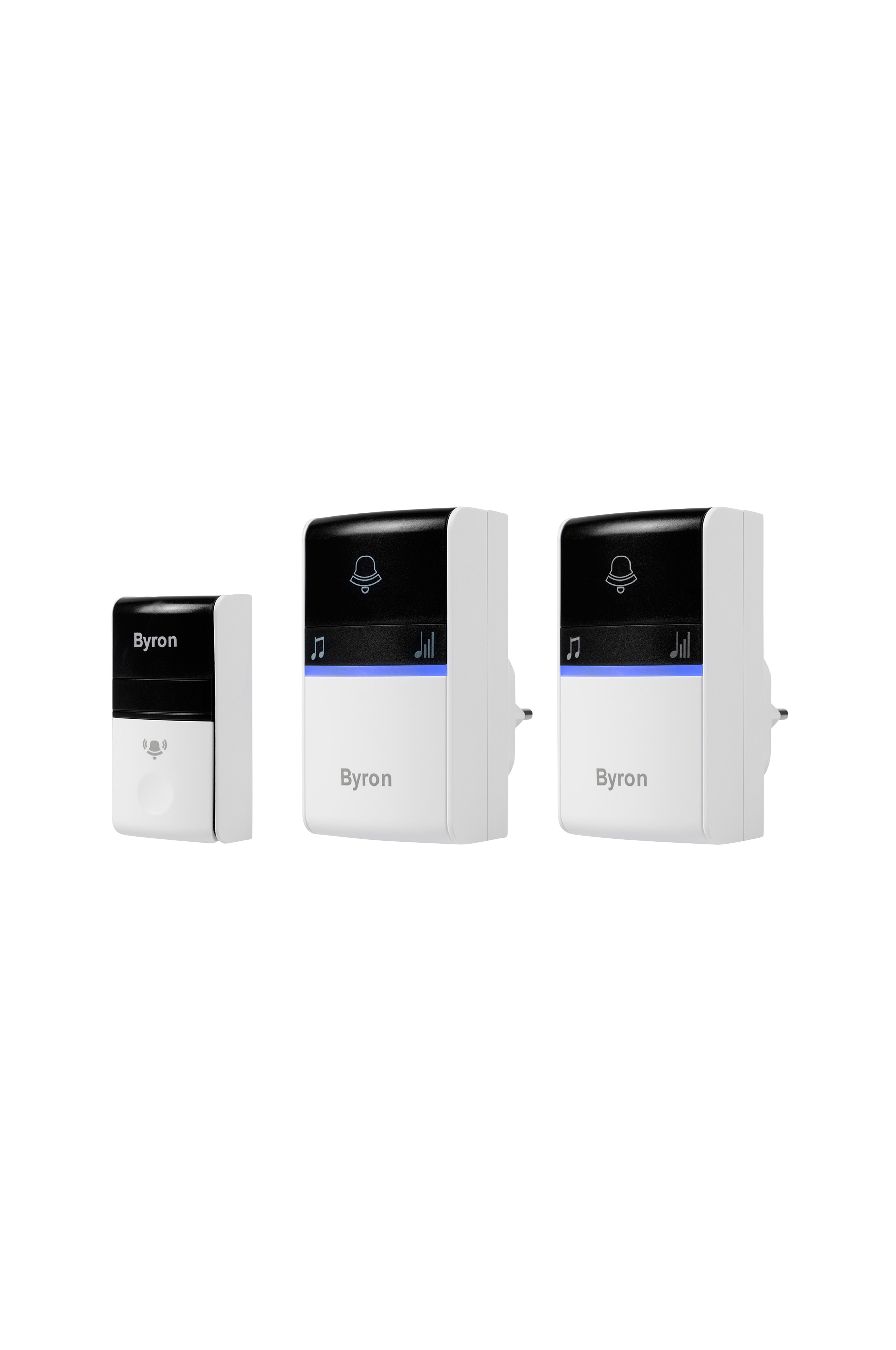 Byron DBY-23415 trådløst dørklokkesæt med to modtagere og kinetisk trykknap. Intet behov for batteriskift takket være kinetisk energi. Dørklokken har en rækkevidde på 100 meter og 16 melodier med 5 justerbare lydniveauer. Nem installation med dobbeltklæbende tape. Knap og modtager er vejrbestandige og nemme at placere overalt i hjemmet.