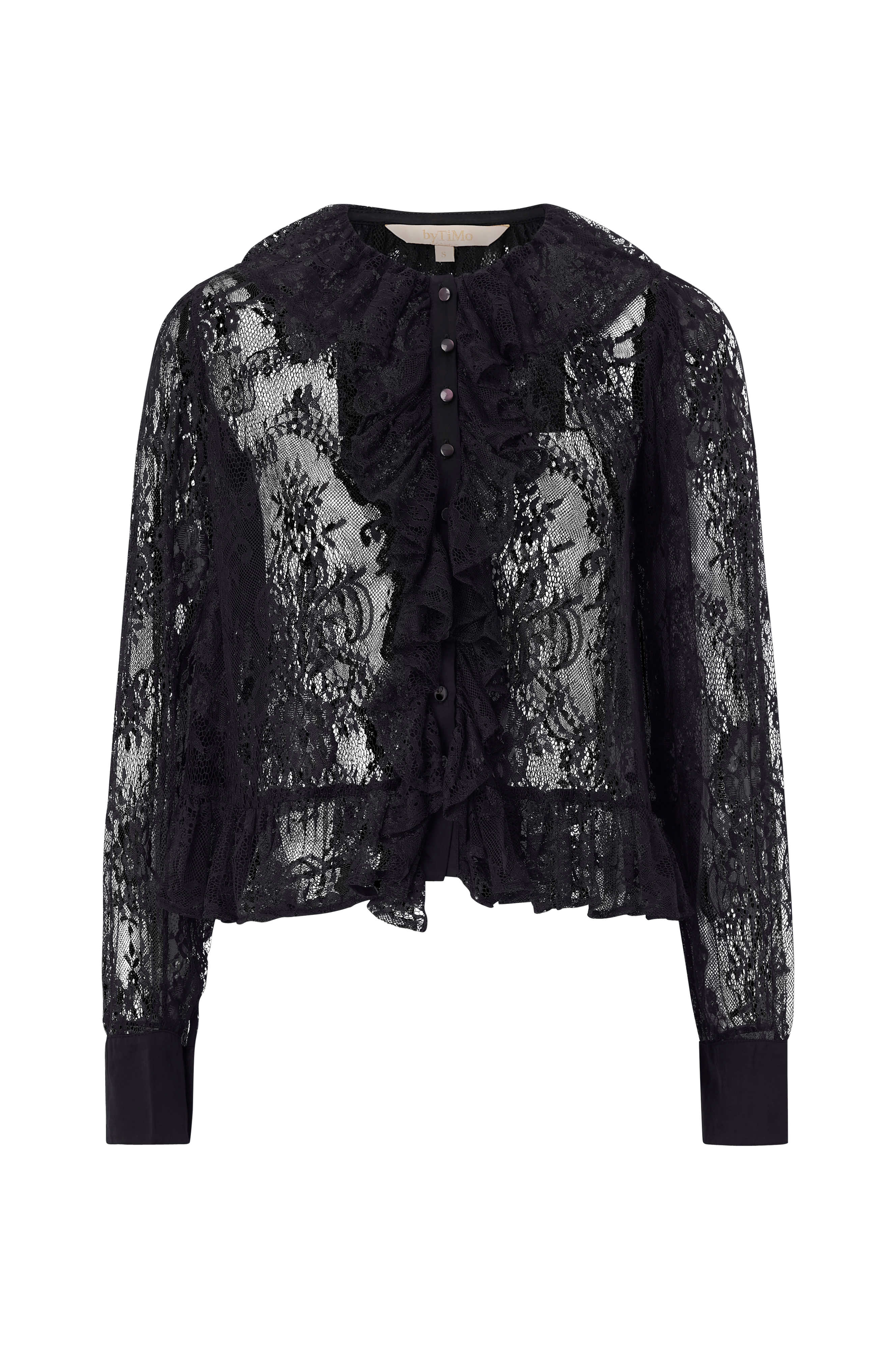 • Blondebluse med rund halsudskæring og volant rundt om halsen• Lange pufærmer med manchetter i satin• Knaplukning foran foran med volant• Volant nederst