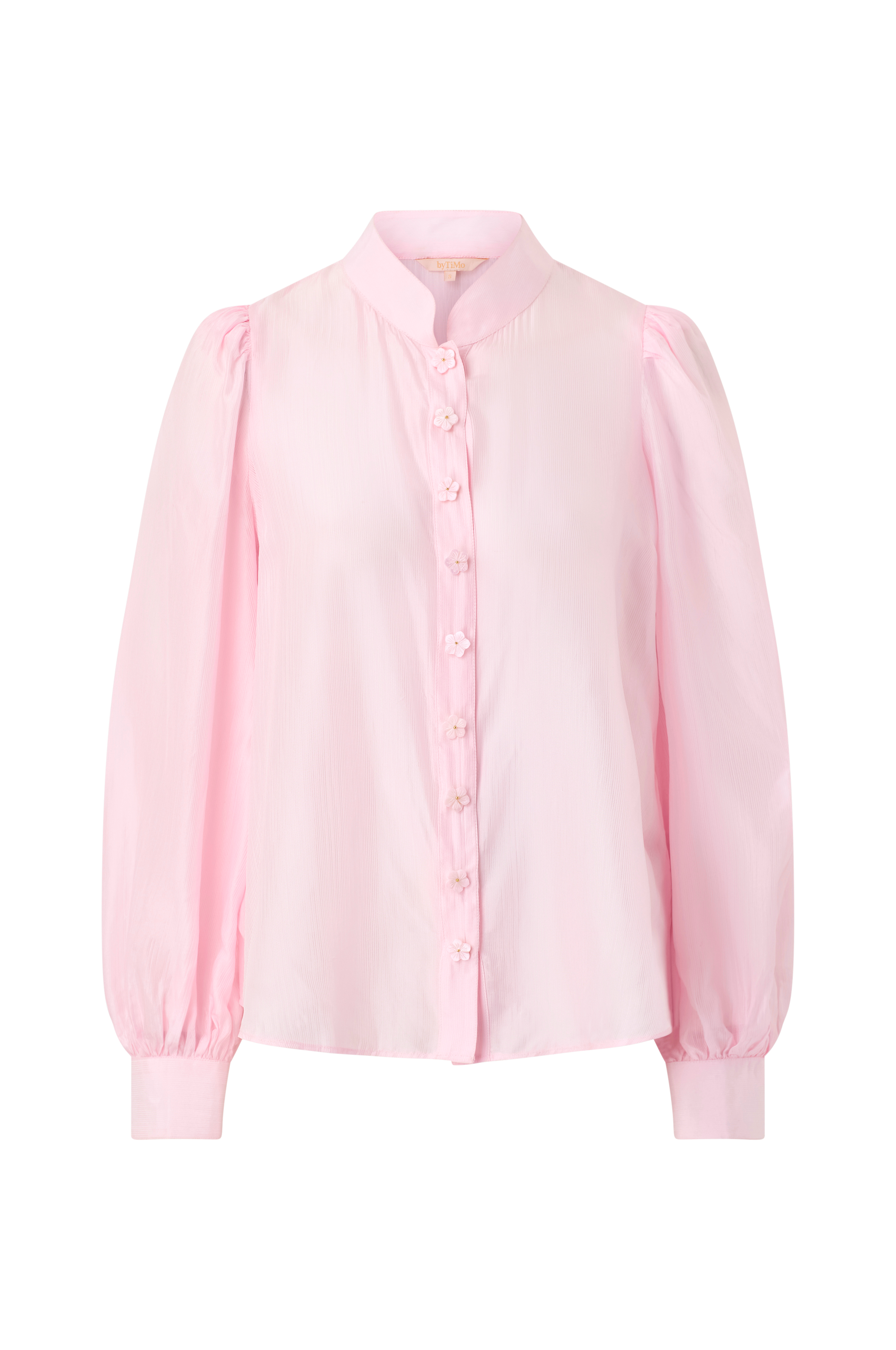 • Transparent, let skinnende bluse i organza• Opretstående krave• Lange ballonærmer med manchetter• Dekorative, blomsterformede knapper foran• Afrundet søm