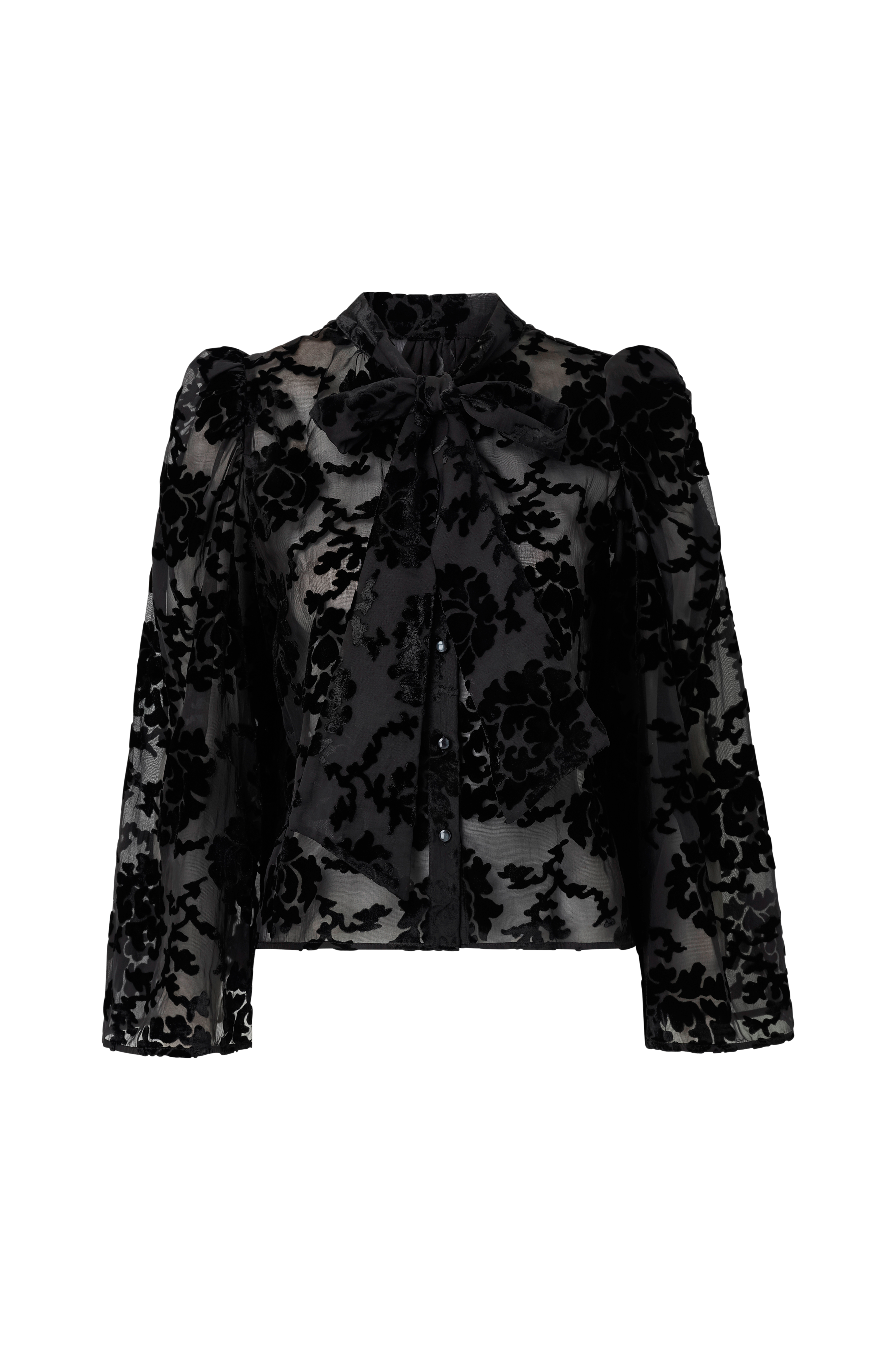 • Transparent bluse med applikationer i fløjl• Opretstående krave• Bindebånd på udskæringen• Lange pufærmer• Knaplukning