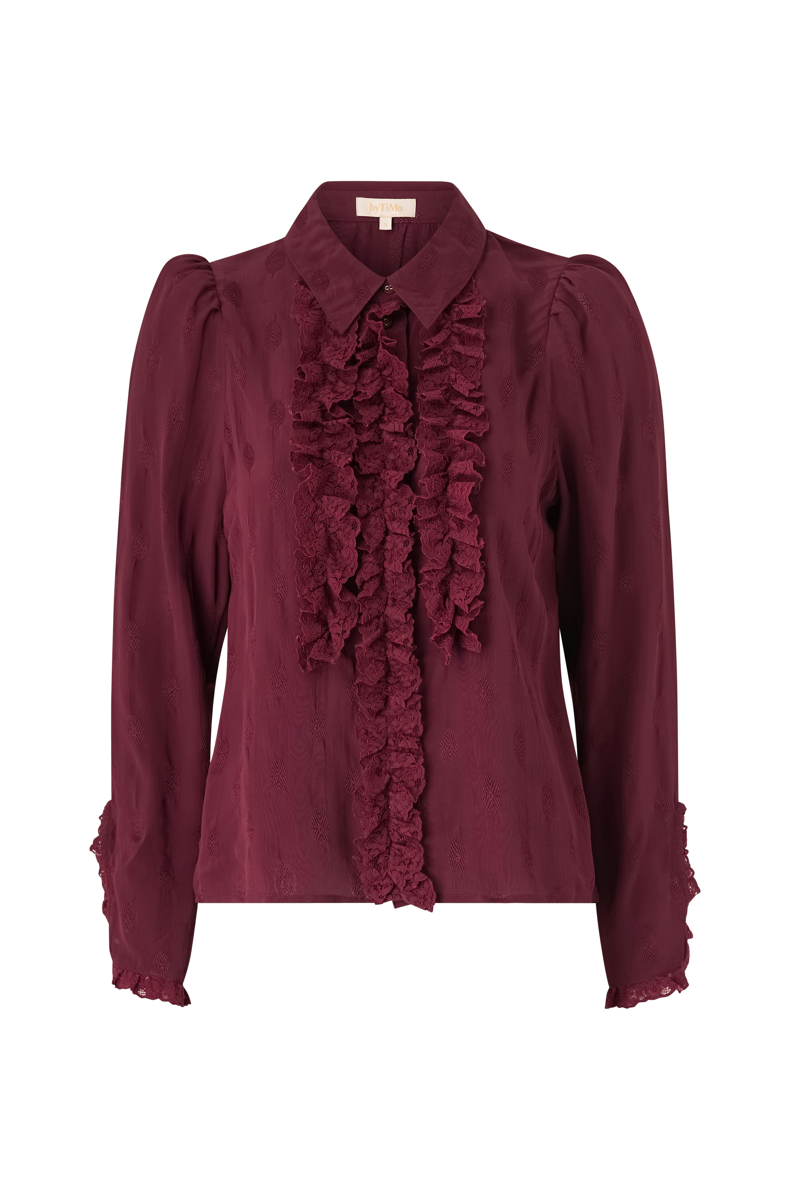 • Bluse i viskose med skjortekrave og broderet mønster hele vejen rundt• Skjult knaplukning foran• Volant i blonde foran• Lange pufærmer med skulderpuder• Slidser ved ærmeafslutningerne med blondekant og knap
