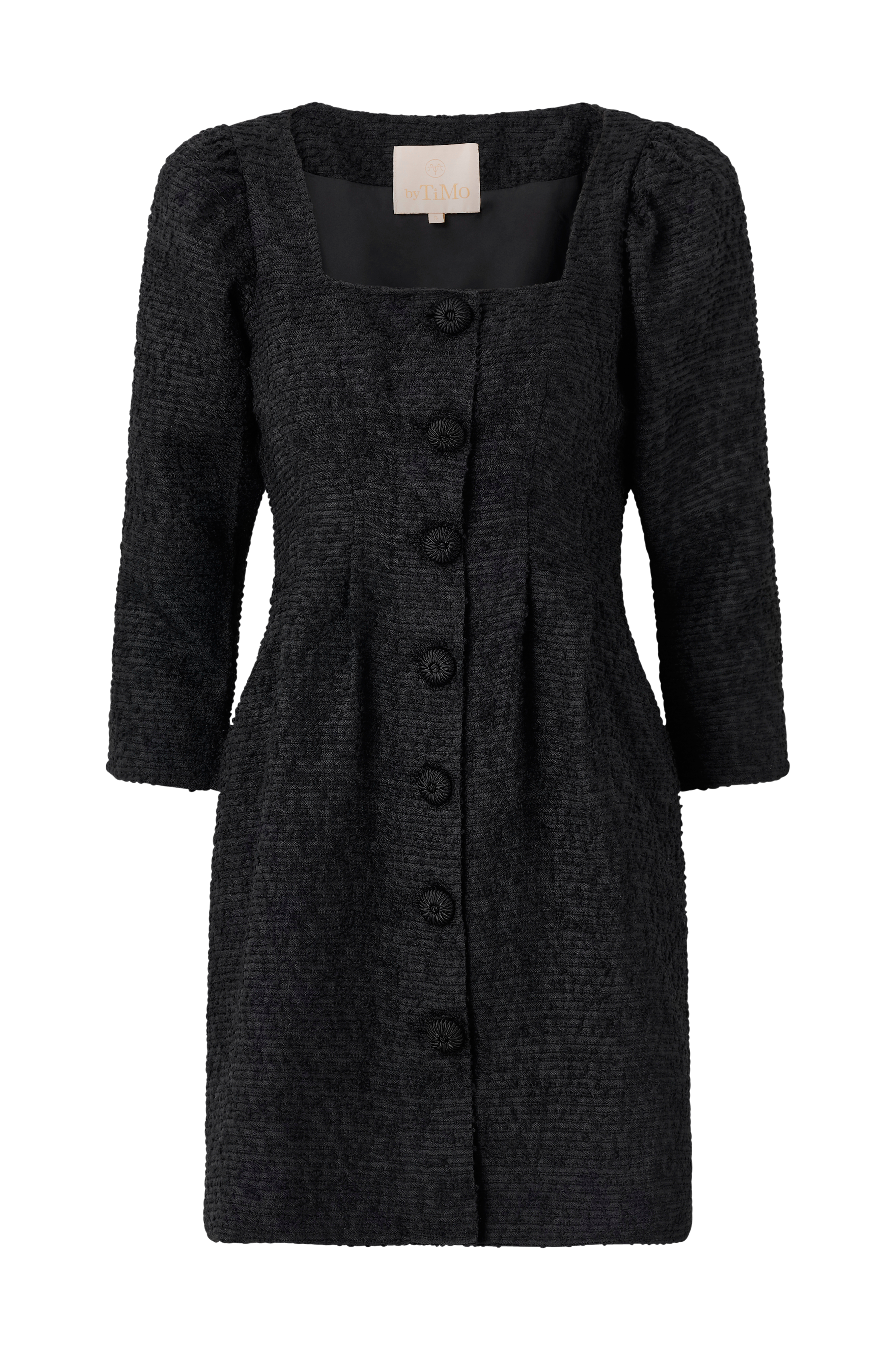 • Kjole i uldblanding med struktur i bouclé• Firkantet halsudskæring• 3/4 lange pufærmer• Knaplukning• Bølgeformede detaljer• Tekstilforing• Længde: 88 cm i størrelse S