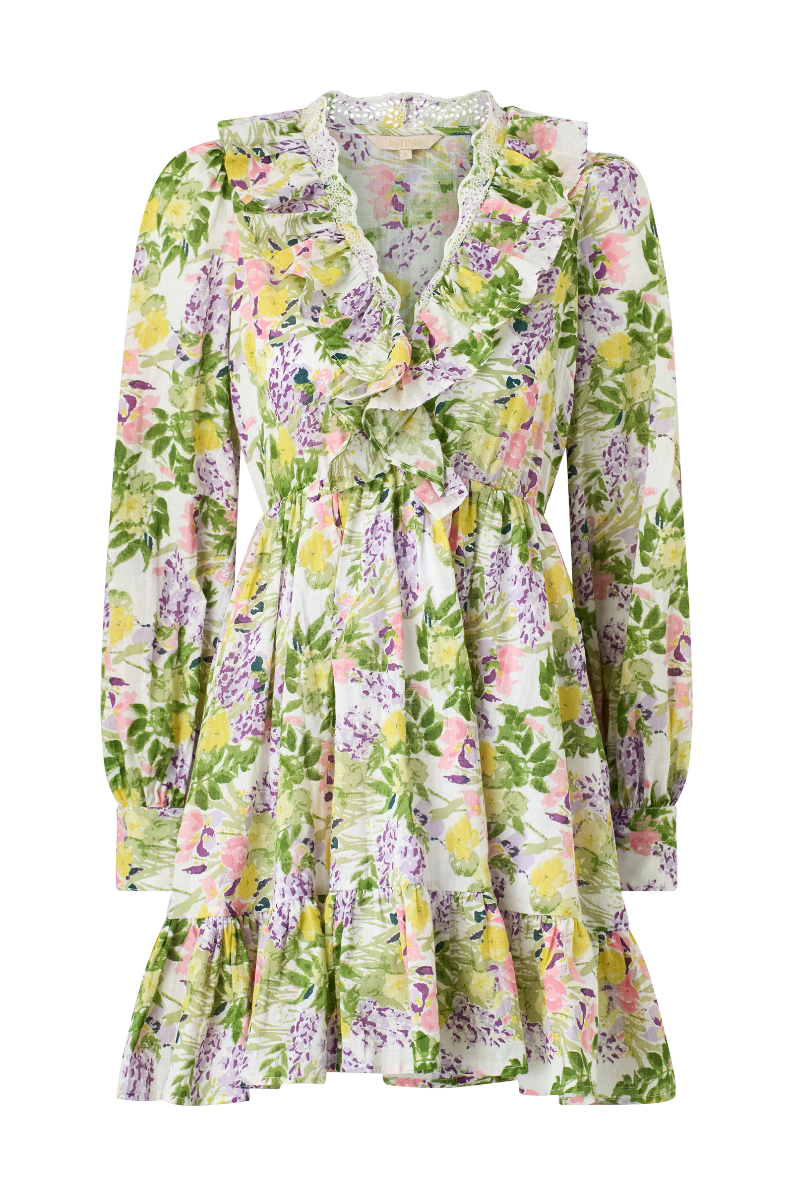 • Kort kjole med hulbroderi på toppen og langs ærmerne• V-udskæring med flæsekant• Lange ærmer med manchetter• Elastik ved taljen• Lynlåslukning i den ene side• Petticoat• Volant ved nederste kant• Normal pasform• Længde: 90 cm i størrelse S
