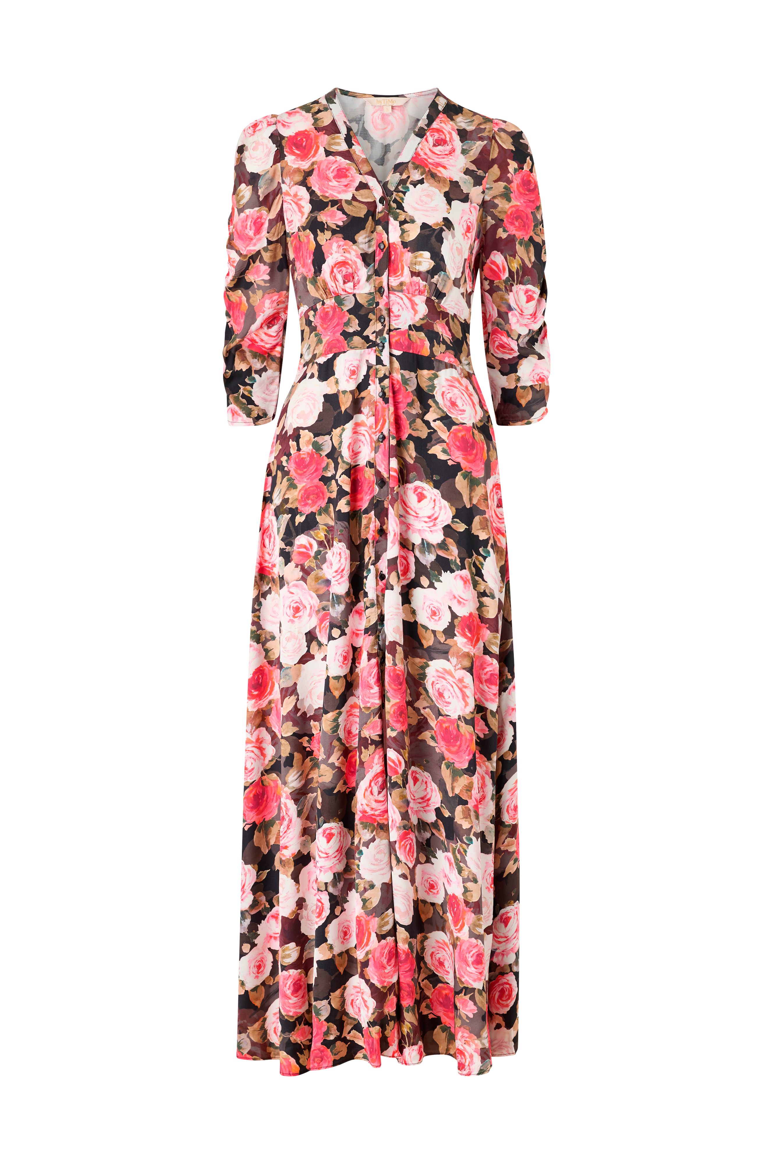 • Mønstret kjole i satin• V-udskæring• Halvlange ballonærmer• Smock i ryggen• Knaplukning• Længde: 141 cm i størrelse S