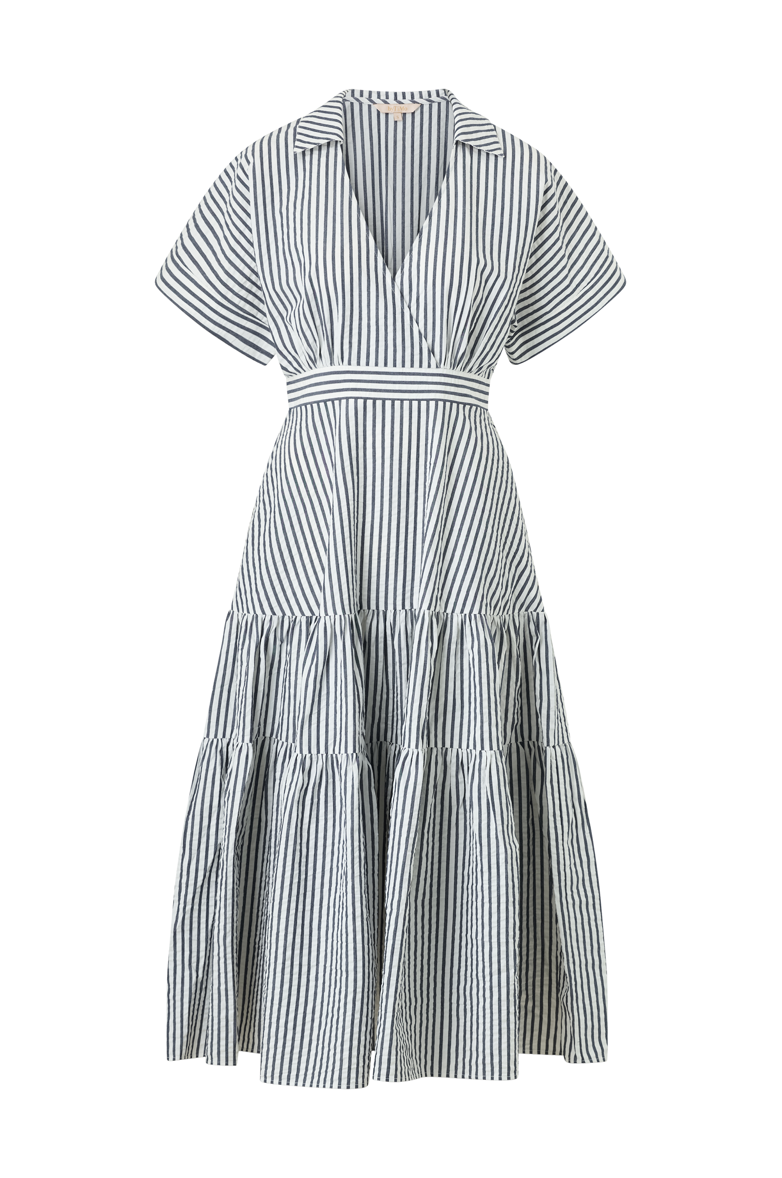 • Lang kjole i bomuld• V-udskæring med krave• Korte ærmer• Slå-om design på toppen• Skjult lynlås i den ene side• Smock bagpå ved taljen• Sidelommer• Volant nederst• Længde: 131 cm i størrelse S