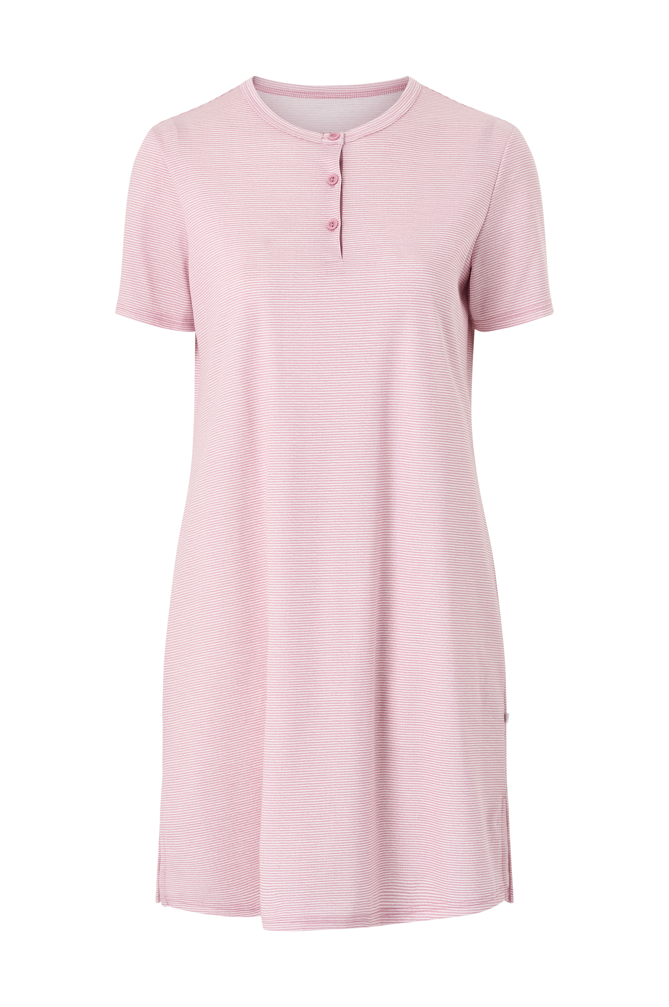 • Blød, stribet natkjole i bomuld• Rund halsudskæring• Kort knaplukning foran• Korte ærmer• Løs pasform• Slids nede i siderne