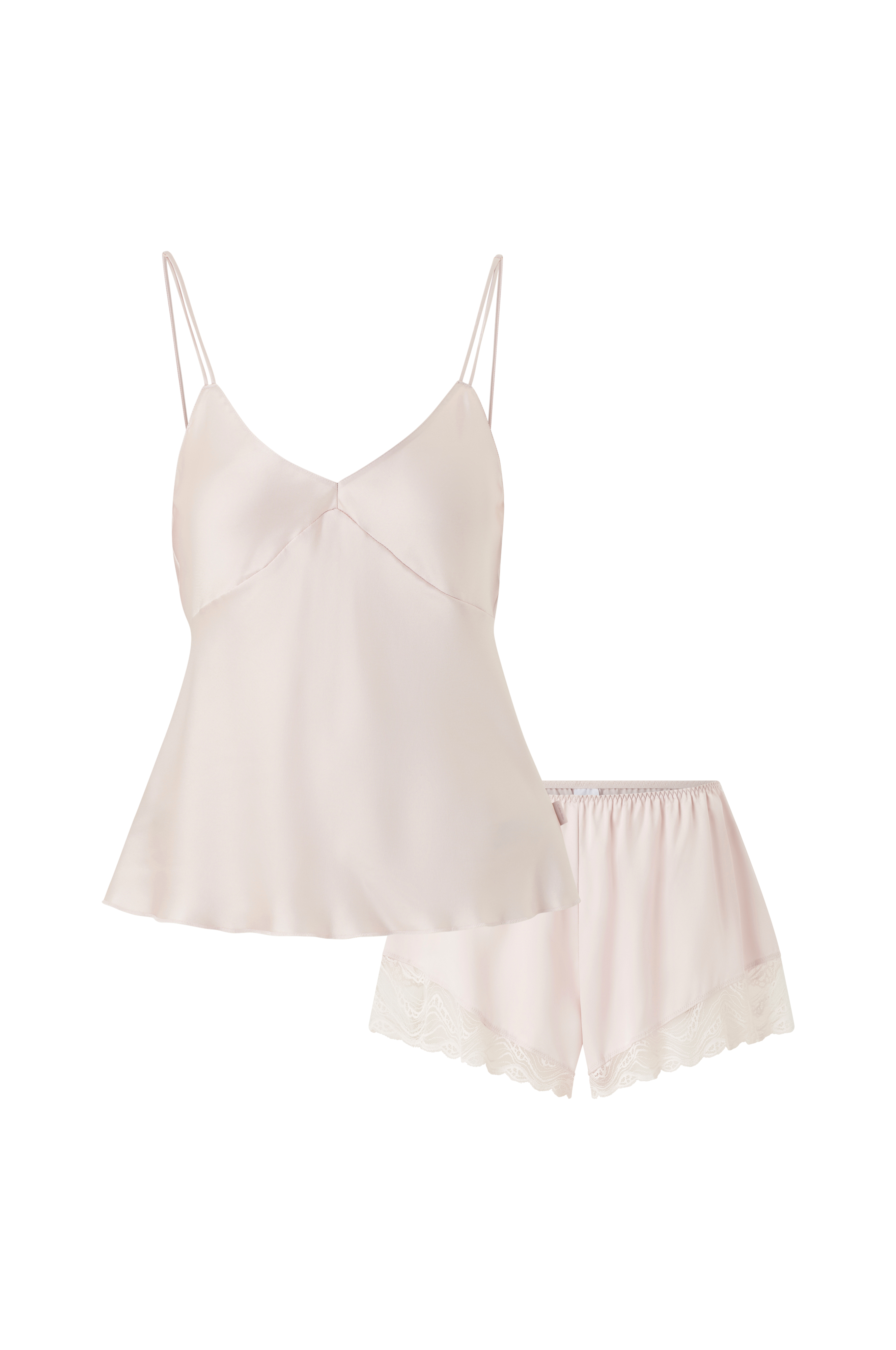 • 2-delt pyjamassæt i skinnende materiale• Undertrøje med justérbare spaghettistropper• Shorts med transparent tip rundt om buksebensåbningerne• Tynd elastik ved taljen