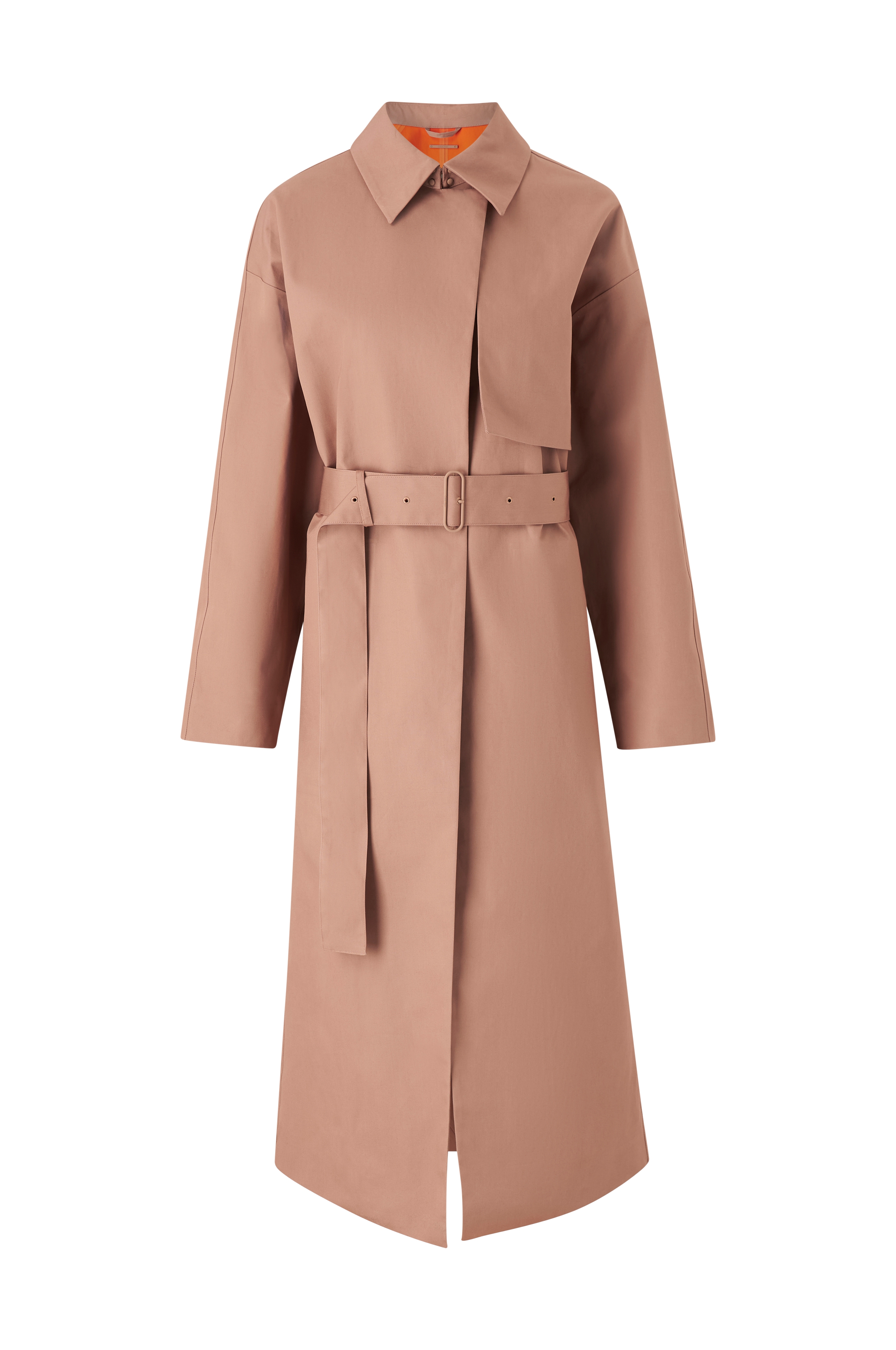 • Lang, stilren frakke• Uforet• Orange inderside• Aftageligt bælte i tekstil• Slids bagpå• Lommer i siderne• Skjulte knapper oppe foran• Længde: 125 cm i størrelse 36