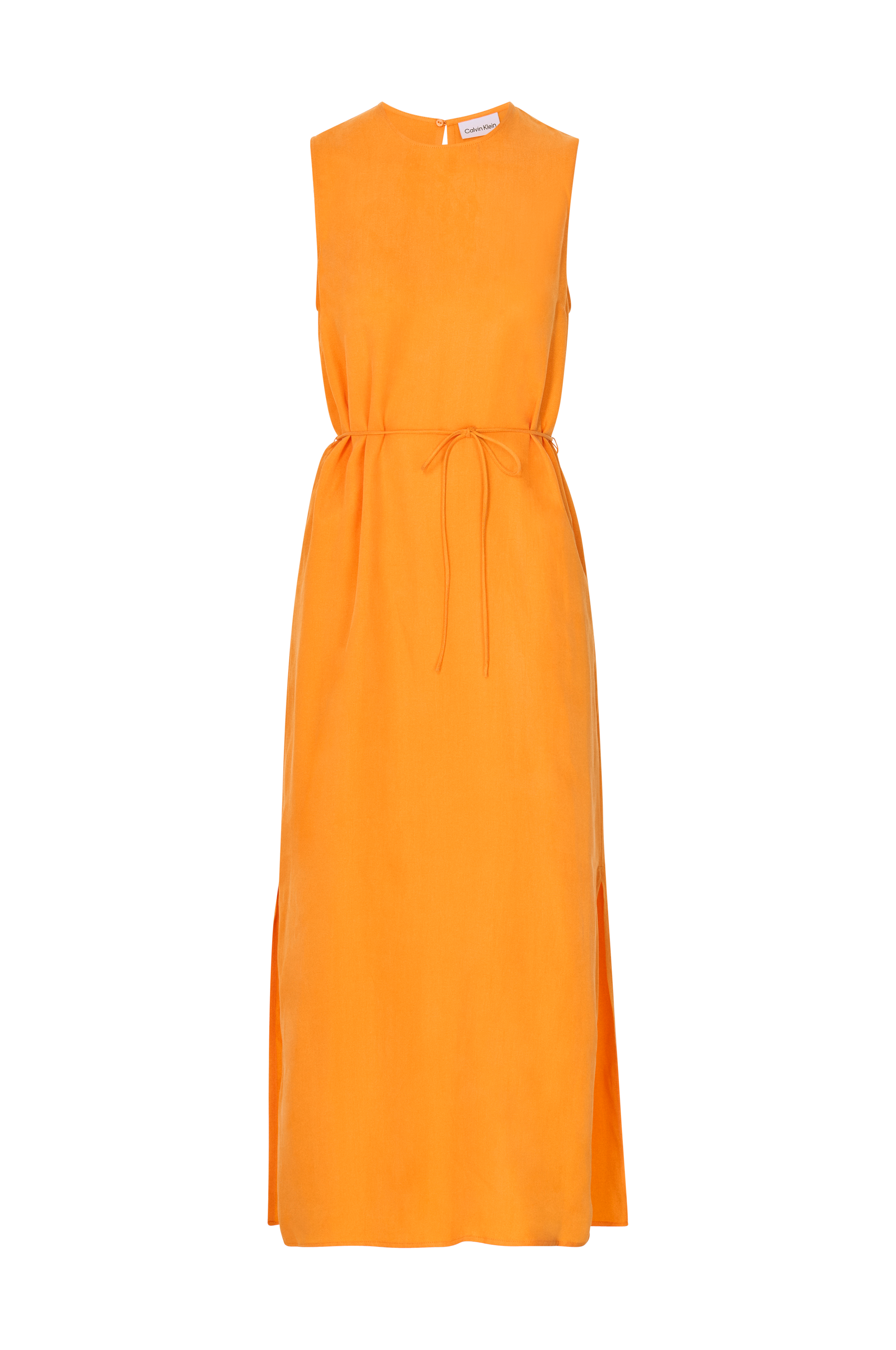 • Ærmeløs kjole• Rund halsudskæring• Ventilation i nakken med knap• Tyndt, aftageligt bindebånd ved taljen• Slidser nede i siderne• Længde: 134 cm i størrelse 36