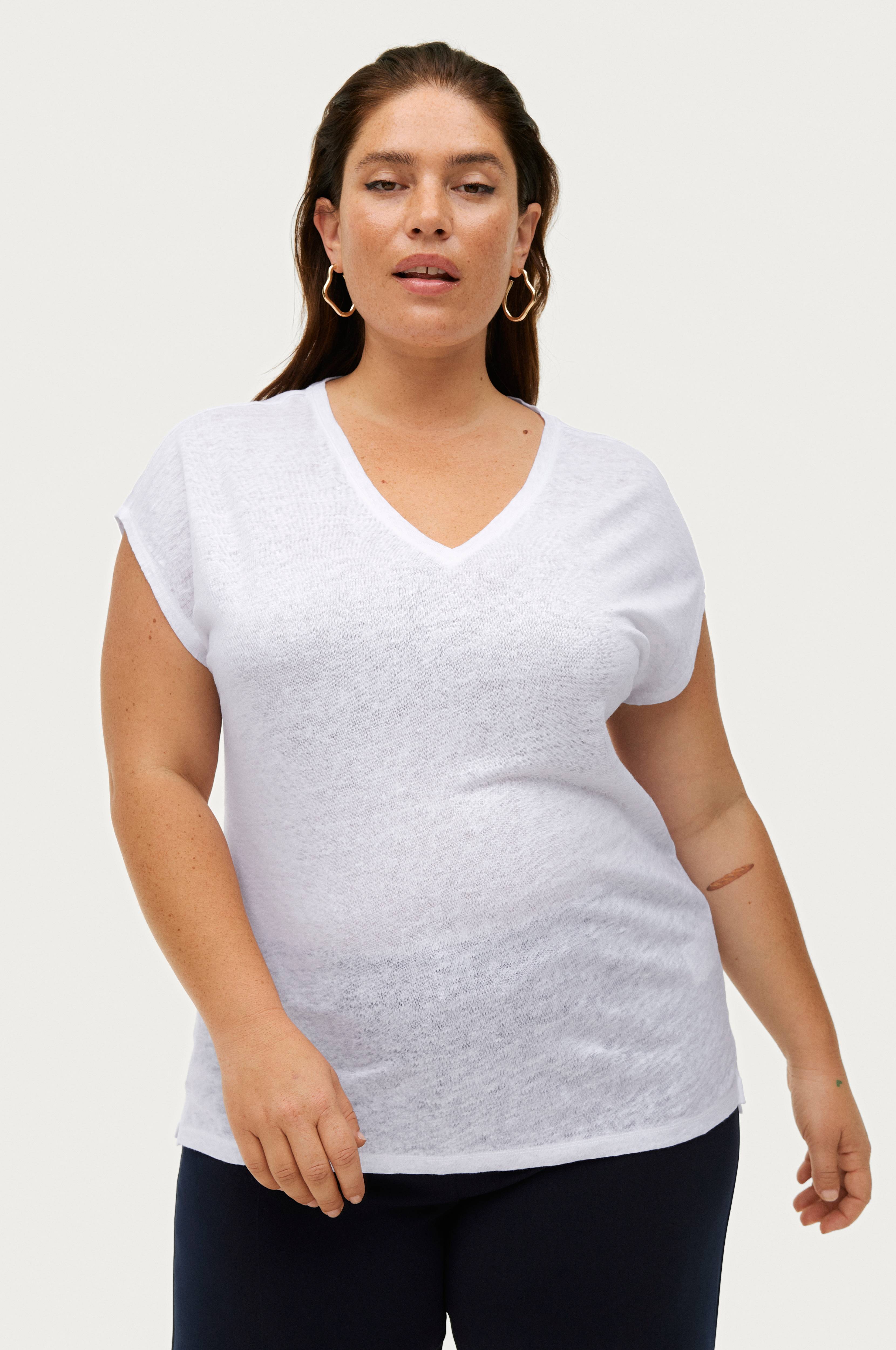 • Kort ærme• V-udskæring• Fremstillet af hør• Store størrelser