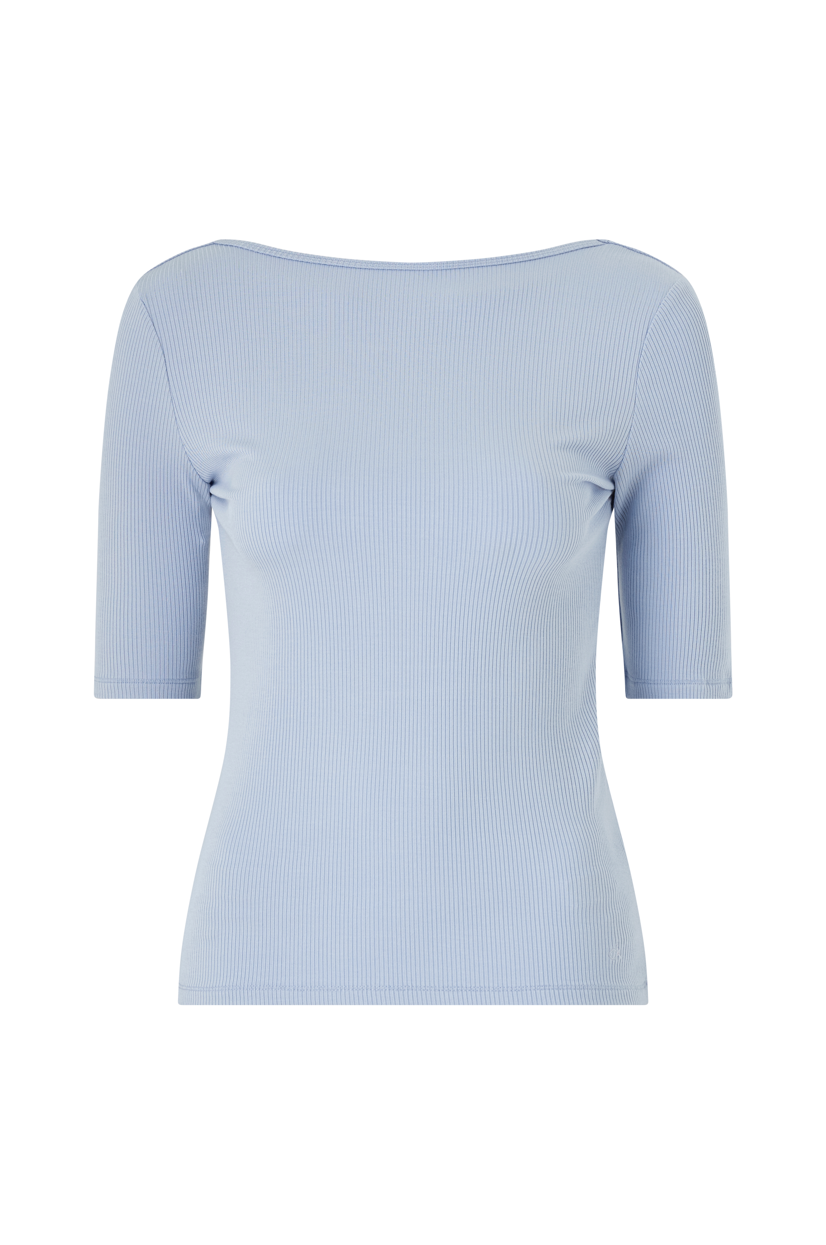 • Ribbet, kortærmet top i modalblanding• Bådudskæring med dyb ryg• Figursyet pasform