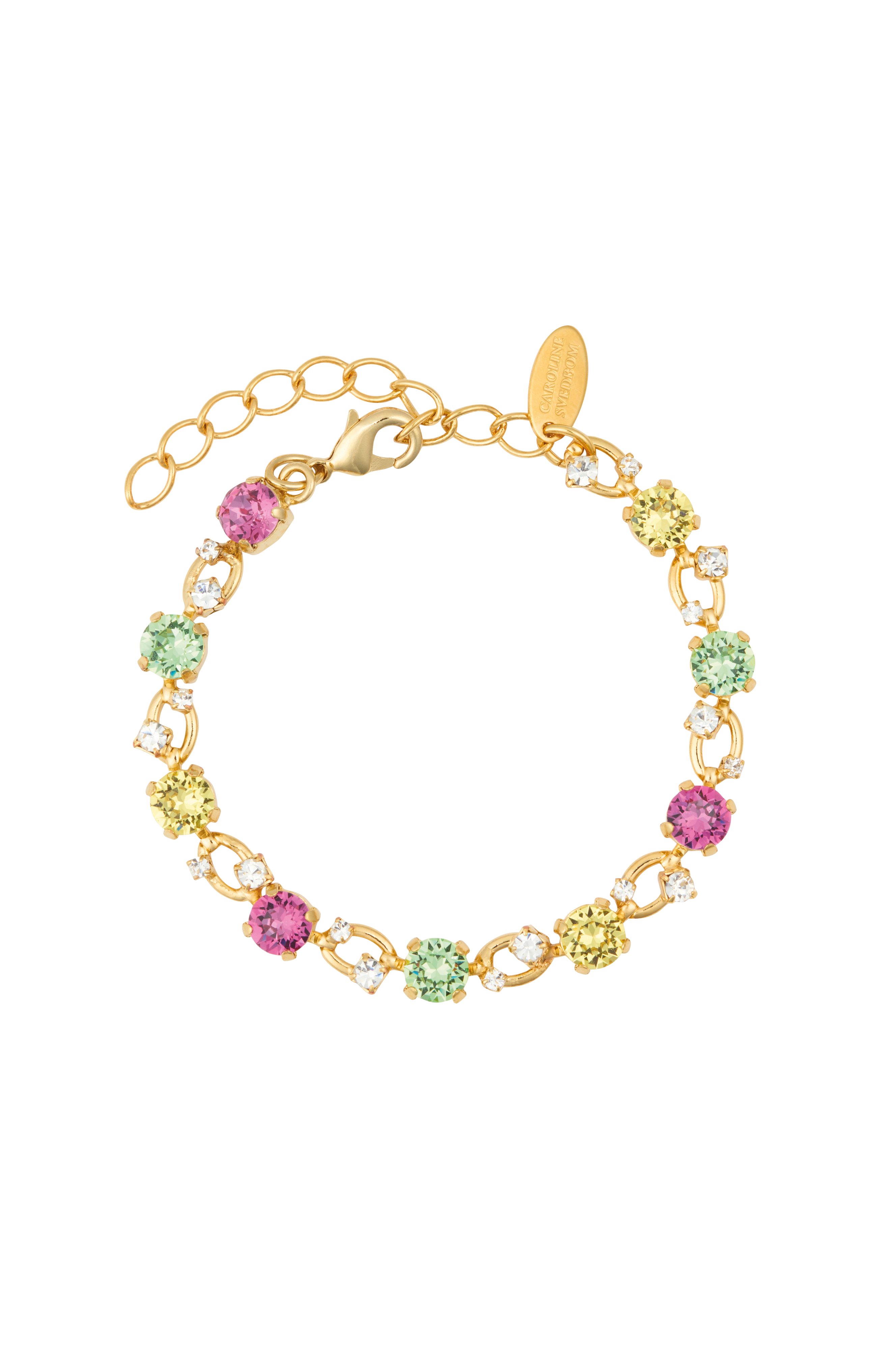 • 18K guldbelægning kæde i messing• Farverige, glitrende krystaller• Graveret logo• Nikkelsikker• Størrelse: 15 cm + 5 cm forlængerkæde• Designet i Sverige, håndlavet i Grækenland