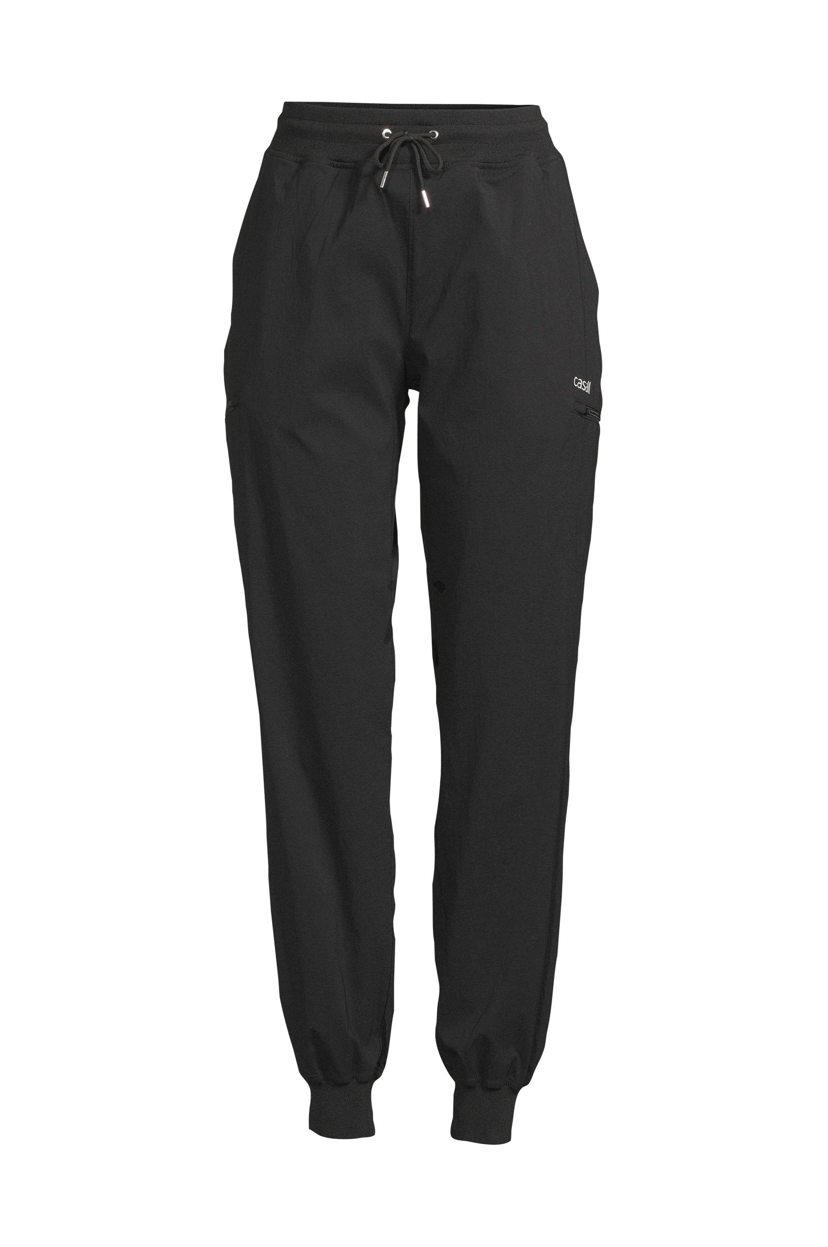 • Elastisk, vævet stof med vandafvisende overflade• Normal pasform på toppen• Smalle ben• Ribbet, elastisk, høj talje med træksnørre• Sidelommer• To benlommer med lynlås• Ribmanchetter ved enden af benene