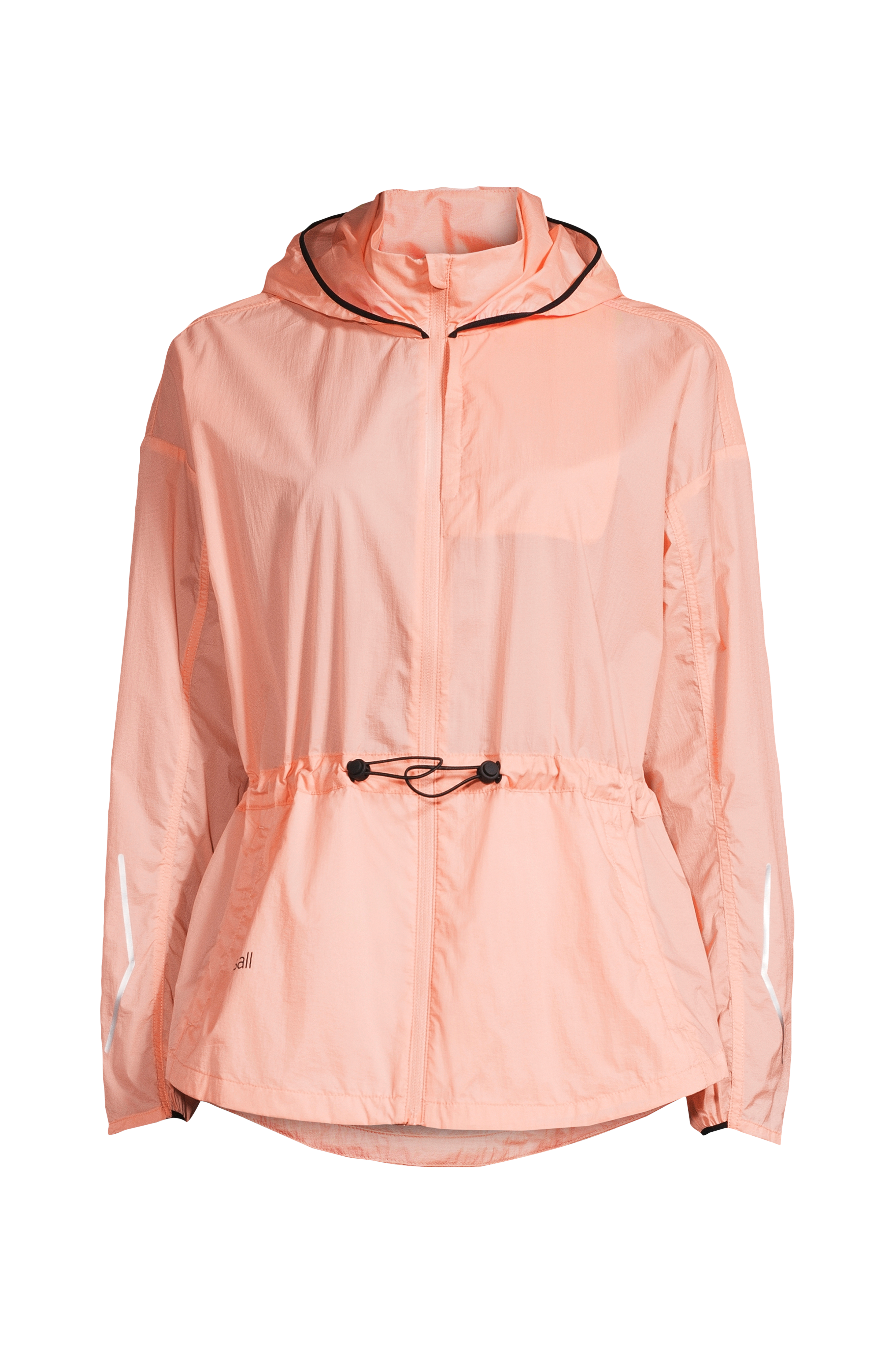 • Superlet, tynd vindjakke med mat glød • Fast hætte med tyndt elastisk bånd langs kanten • Lomme • Høj krave • Lynlås • Træksnørre ved taljen • To lynlåslommer • Tynd elastik ved manchetterne • Reflekterende detaljer på ærmerne og på ryggen • Løst bærestykke på ryggen med åndbart mesh nedenunder