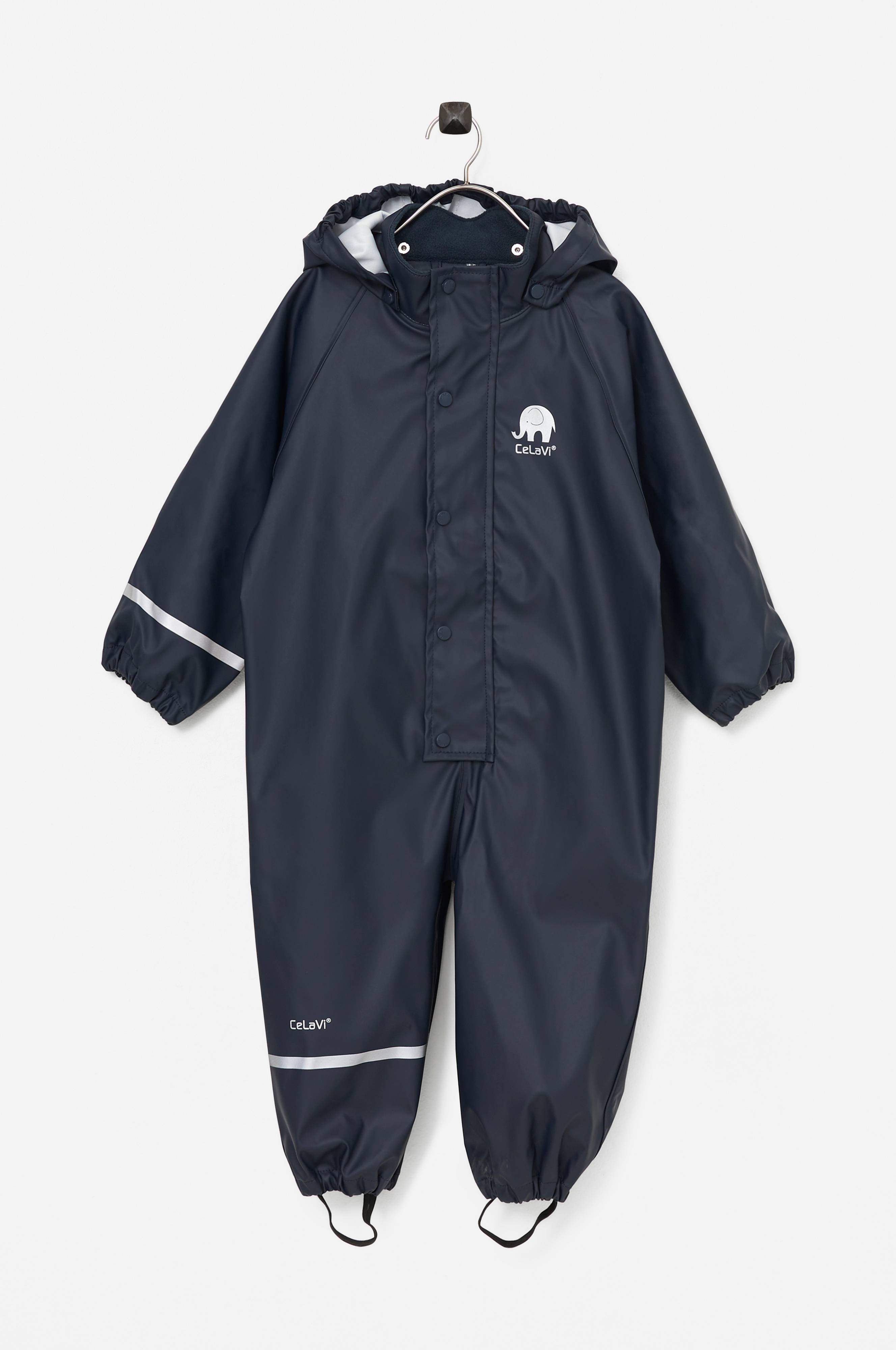 Vandtæt regnheldragt med aftagelig hætte. Høj krave med fleeceforet inderside. Lukning med lynlås og overfald med trykknapper. Elastik i ærmekanten og benkanterne. Elastiske fodstropper. Refleksdetaljer på ærmer og ben.