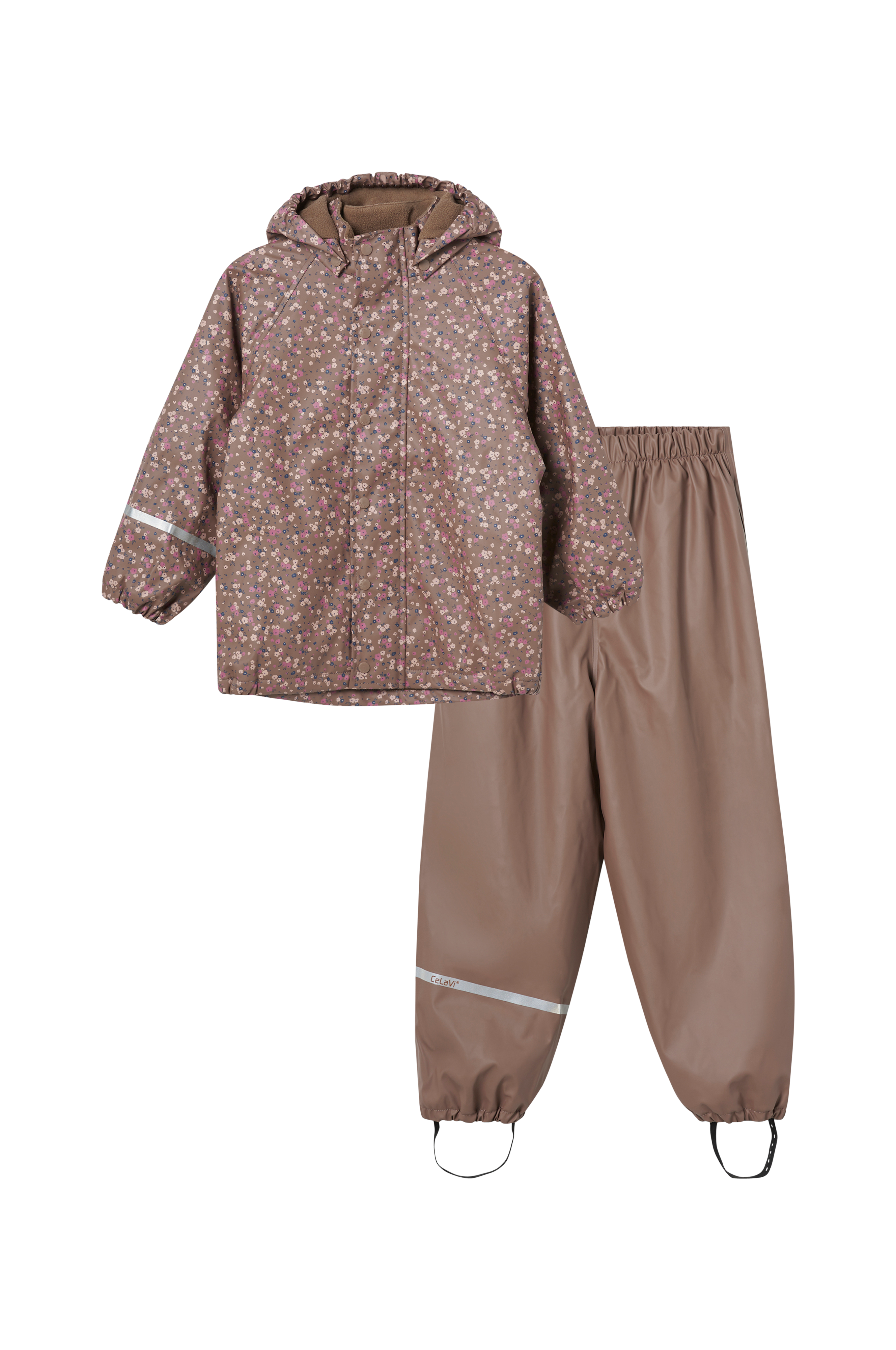 • Regnsæt med jakke og bukser • For i blød, varm fleece • Jakke med aftagelig hætte • Høj krave • Lynlås • Vindflap over lynlåsen med trykknapper • Elastisk bånd ved manchetterne og ved nederste kant • Bukser med elastisk talje med indvendig træksnørre • Elastisk bånd ved enden af benene • Aftagelige, elastiske fodstropper i silikone • Reflekterende detaljer
