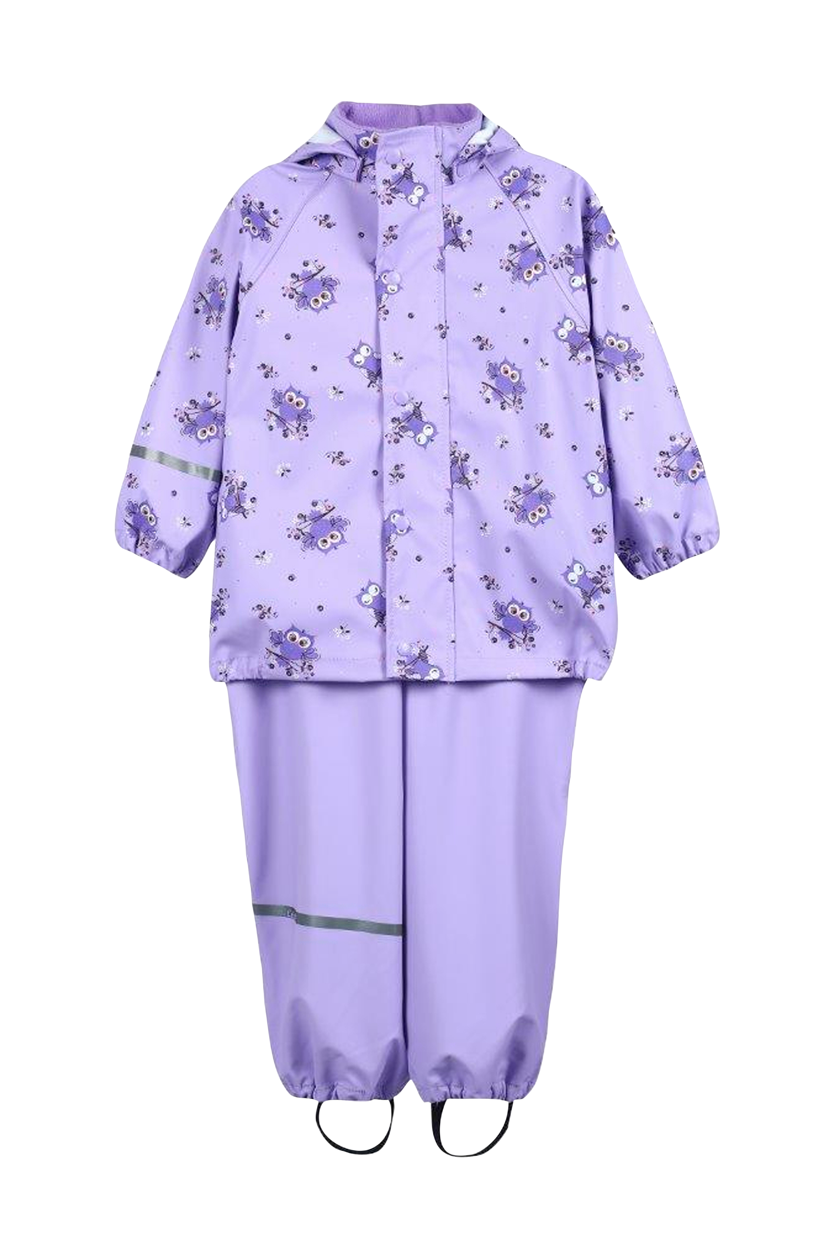 Regnsæt i PU-kvalitet med jakke og bukser. Jakken har printet mønster og aftagelig hætte. Høj krave med fleece på indersiden. Lynlås og beskyttende overfald med trykknapper over lynlåsen. Elastik i ærmekant og i siderne forneden. Bukserne har elastisk talje og elastik i benkant. Elastiske fodstropper. Refleksdetaljer på ærmerne og benene.