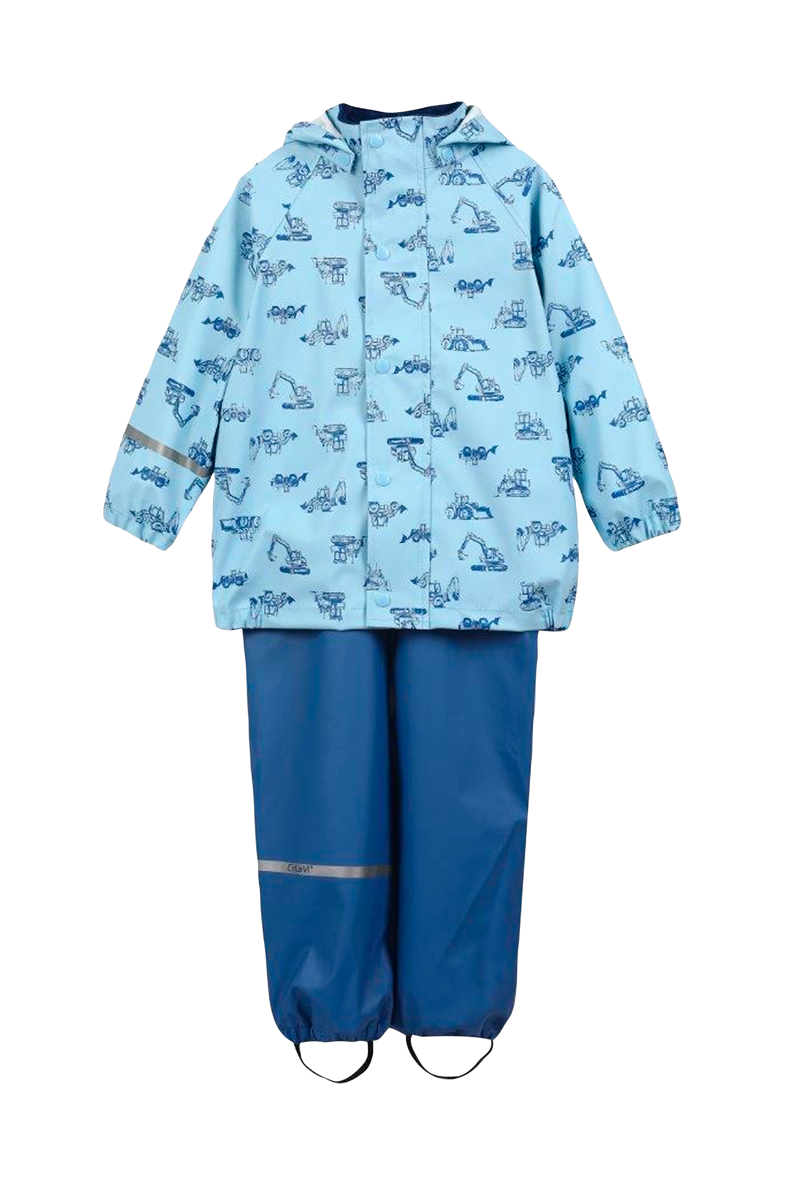 Regnsæt i PU-kvalitet med jakke og bukser. Jakken har printet mønster og aftagelig hætte. Høj krave med fleece på indersiden. Lynlås og beskyttende overfald med trykknapper over lynlåsen. Elastik i ærmekant og i siderne forneden. Bukserne har elastisk talje og elastik i benkant. Elastiske fodstropper. Refleksdetaljer på ærmerne og benene.