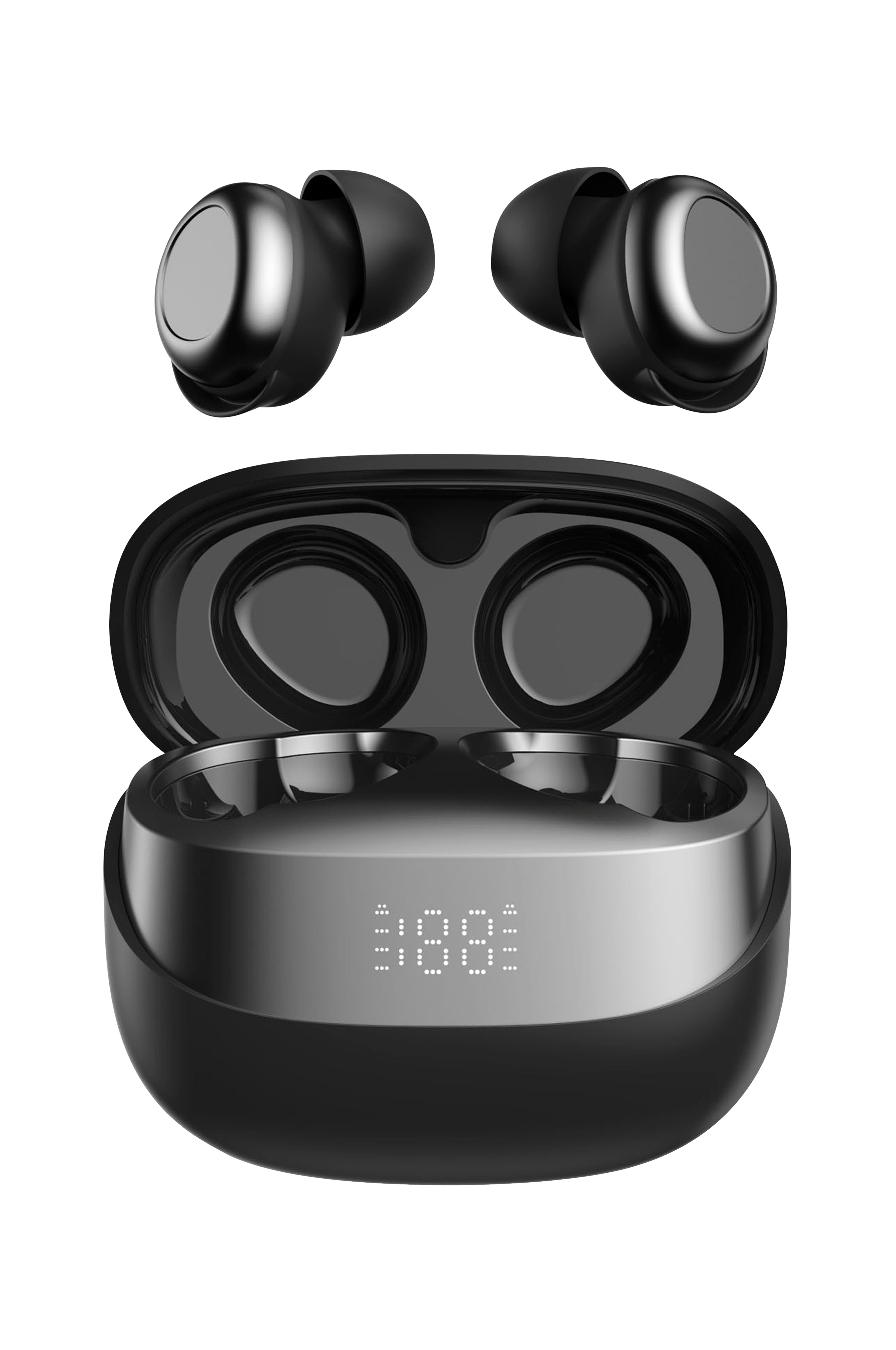 Leveres med et opladningsetui. LED-displayet på opladningsetuiet viser den resterende opladning i høretelefonerne.