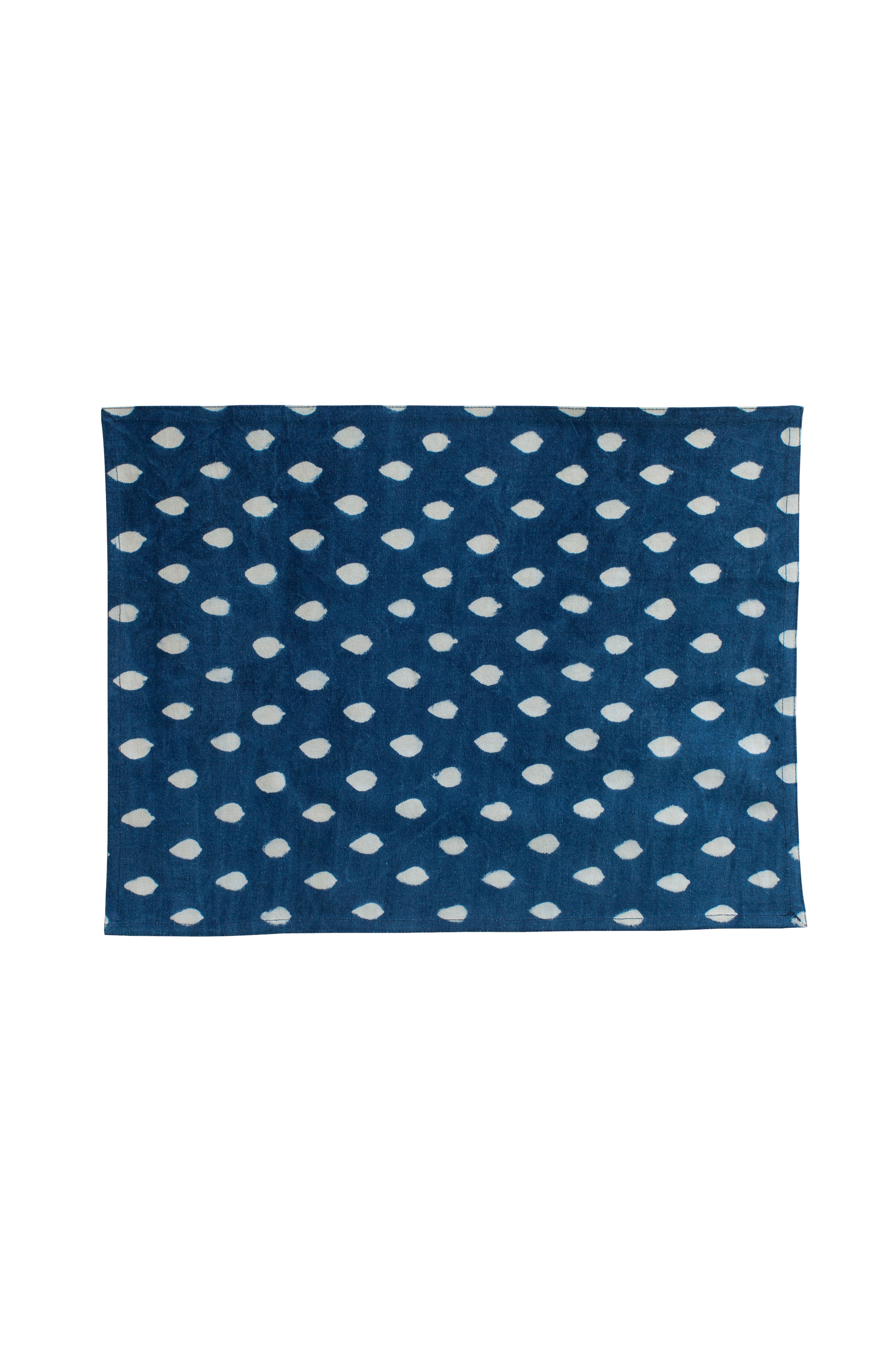 Sæt med to indigoblå dækkeservietter i bomuld. Mønstret er håndtrykt med træblokke i traditionel indisk blokprintteknik og farvet med indigopigment. Denne teknik giver mønsteret sit levende og dekorative udtryk. Et unikt håndværk! Alle indigoprodukter kan og vil miste farve, selv når de er tørre. Vask altid tekstiler, der er farvet med indigo, separat på et kort program til uld/silke ved 30 grader. Brug skånsomt vaskemiddel uden blegemiddel. Vi anbefaler ikke at tørretumble tekstilerne.