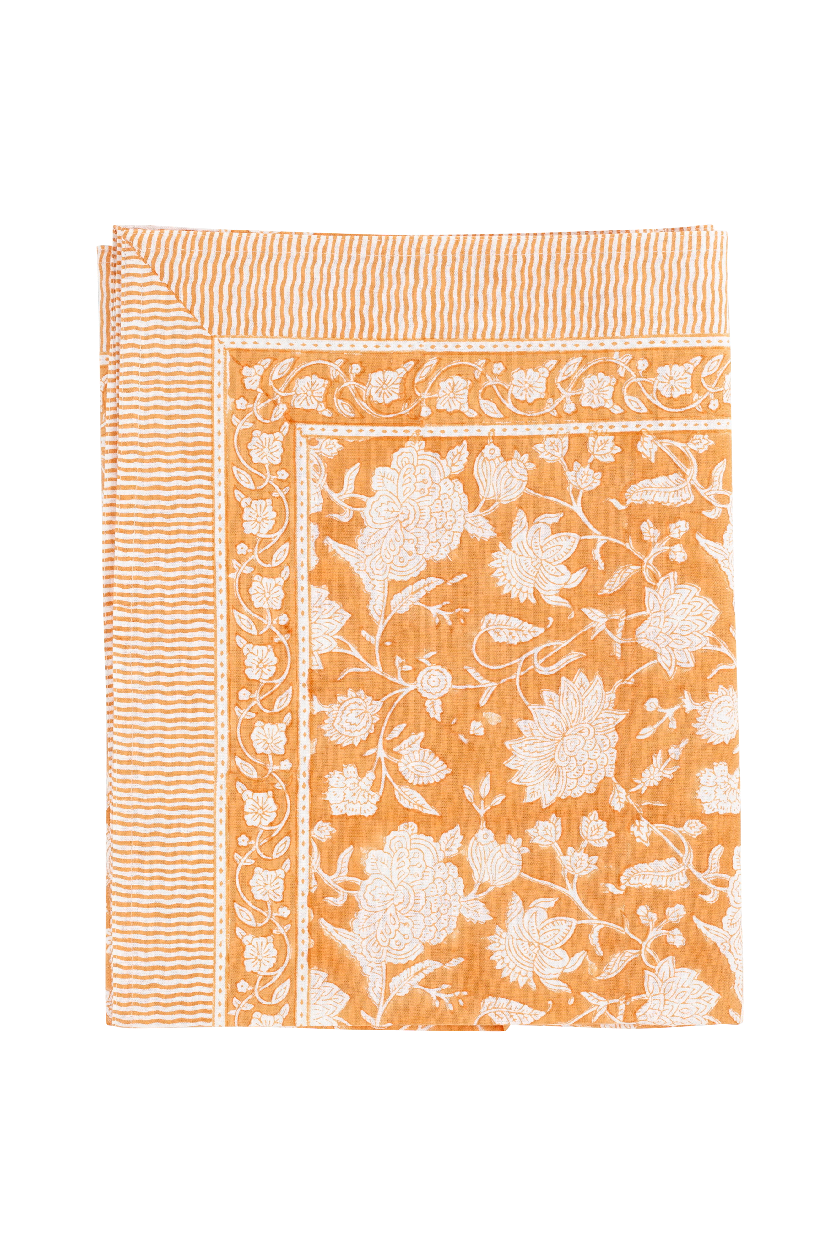 En elegant dug i bomuld af høj kvalitet med et smukt blomstermønster og en dekorativ kant. Mønsteret er trykt i hånden ved hjælp af traditionelle Indian bloktrykteknikker. Et unikt håndværk, der giver hver dug et unikt udtryk. Vask din dug på et kort (maks. 1 time) og skånsomt program for uld/silke med mildt vaskemiddel. Stryges som bomuld.
