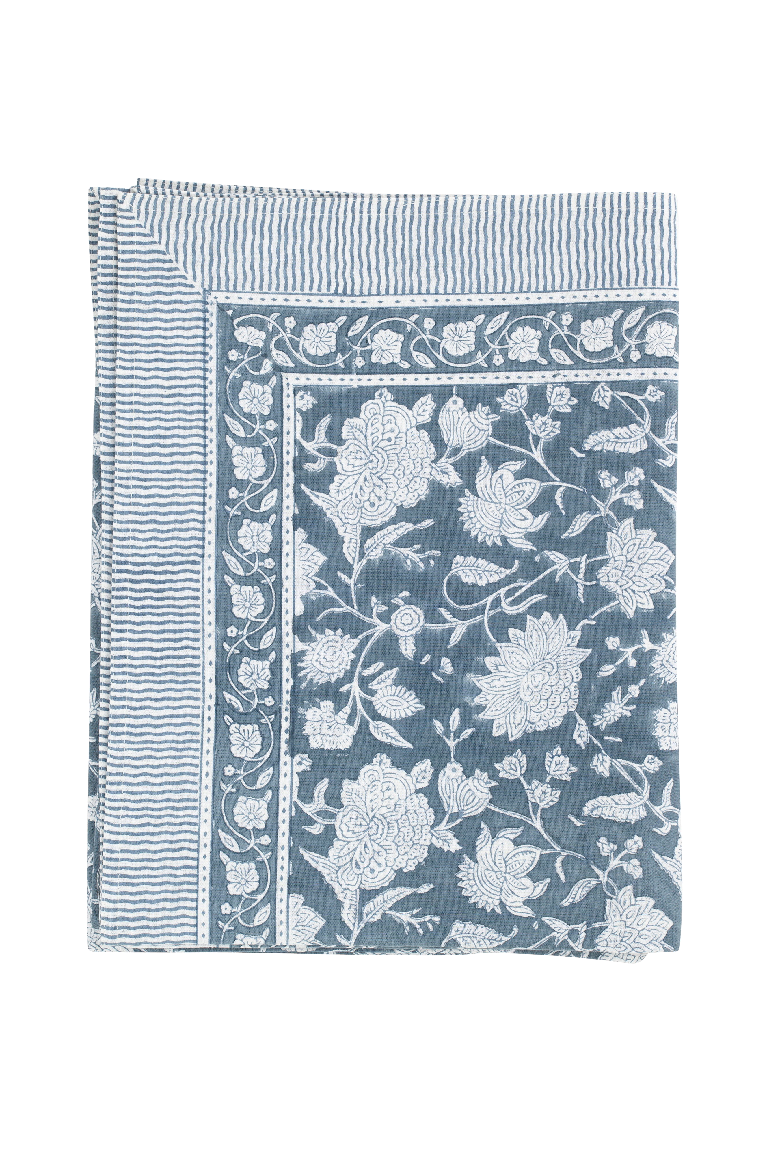 En elegant dug i bomuld af høj kvalitet med et smukt blomstermønster og en dekorativ kant. Mønsteret er trykt i hånden ved hjælp af traditionelle Indian bloktrykteknikker. Et unikt håndværk, der giver hver dug et unikt udtryk. Vask din dug på et kort (maks. 1 time) og skånsomt program for uld/silke med mildt vaskemiddel. Stryges som bomuld.
